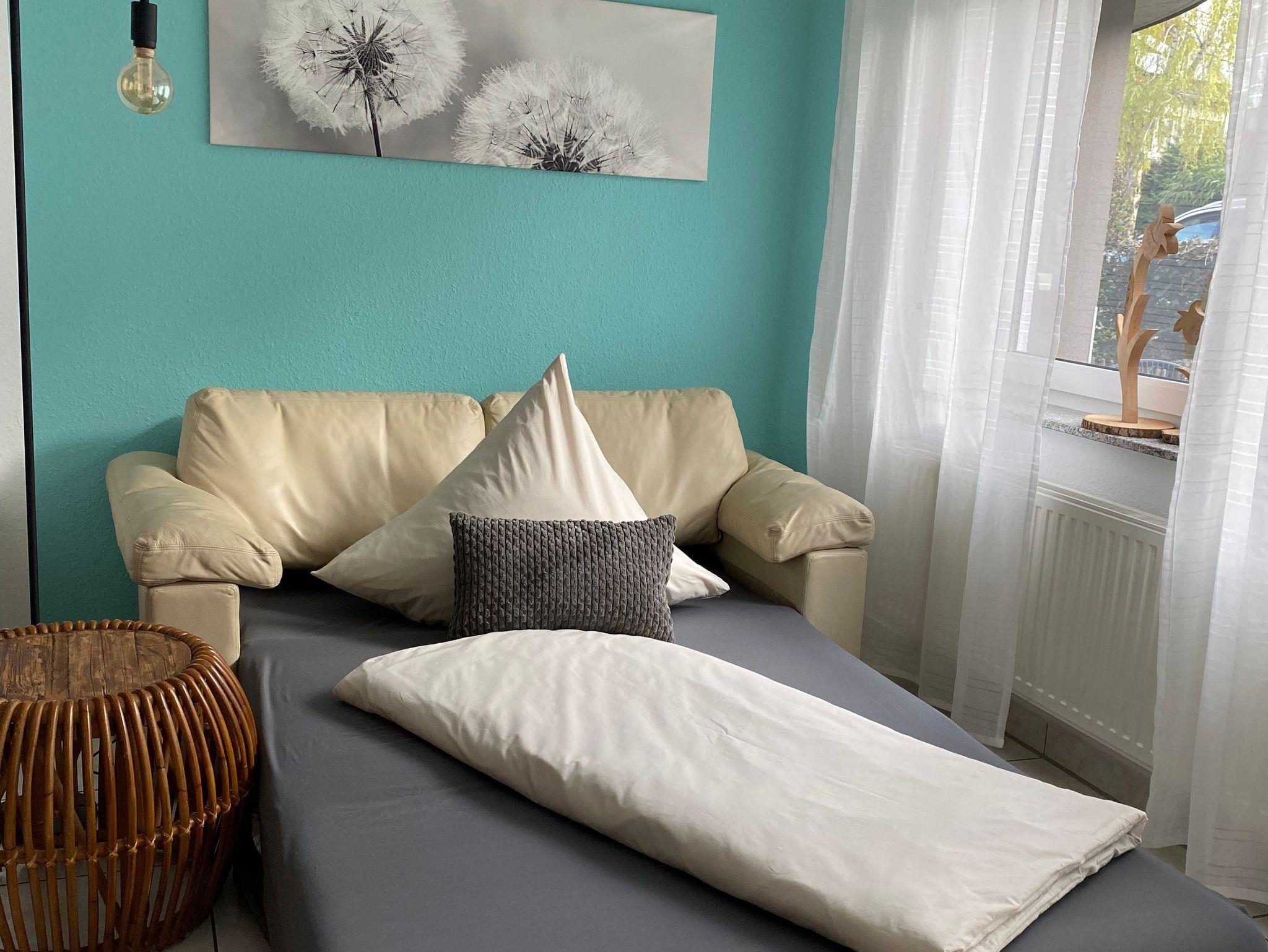 Das Sofa im Wohnbereich lässt sich zu einem Zweitbett Liegefläche/Breite 1,40m ausziehen. (Toll für Kids!)