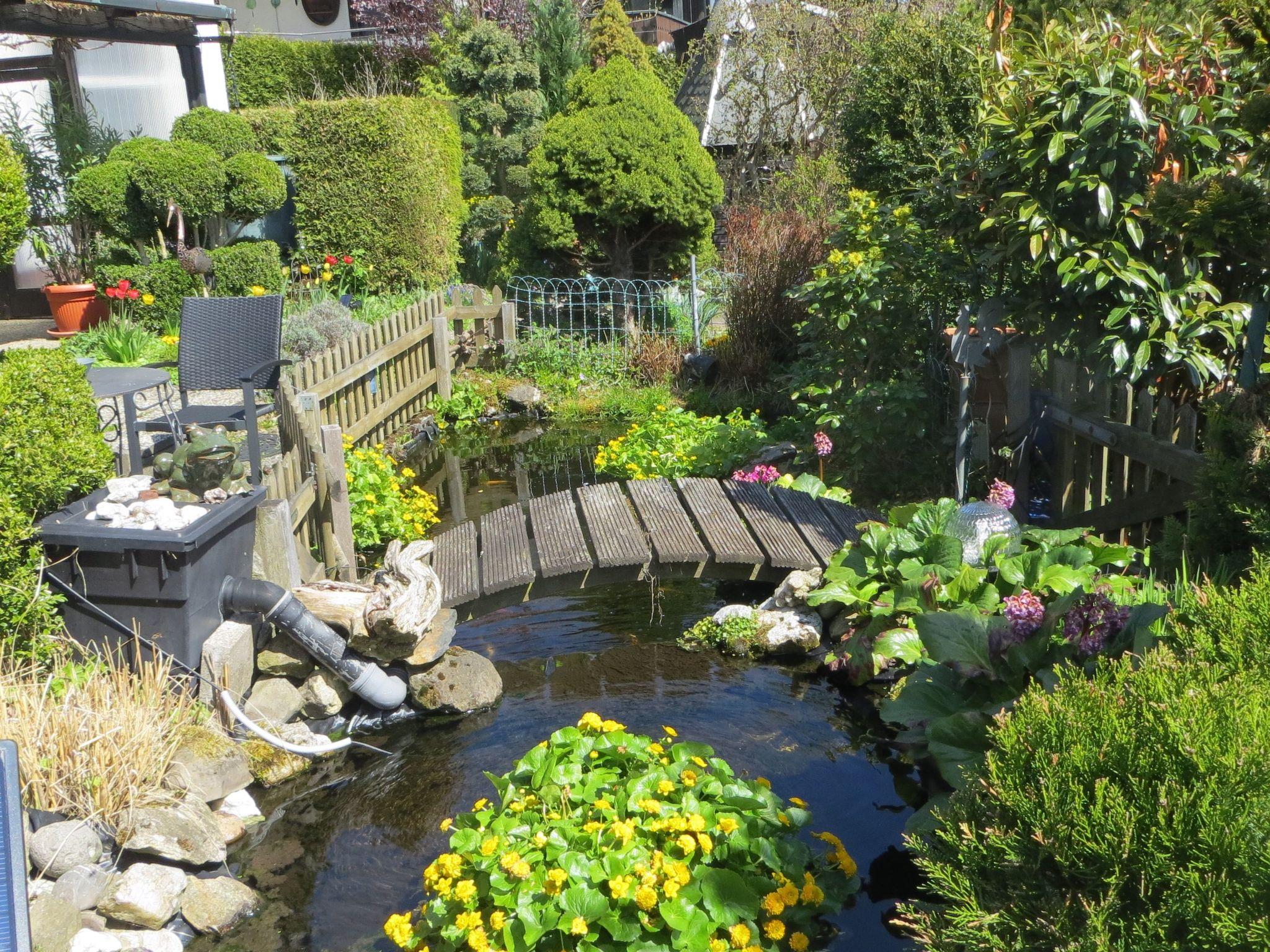 Facilities: Light-flooded living/dining room with sofa set, dining area and satellite TV, WLAN, barrier-free shower, WC, washing machine, storage room, fitted kitchen, 1 bedroom, vine-covered pergola with large seating area and open fireplace. The view of the garden with koi pond is a dream! A seating area right by the pond invites you to linger. Towels, bed and table linen and kitchen inventory are of course provided. The kitchen is very well equipped. The bathroom with underfloor heating offers every comfort with an oversized, barrier-free shower, WC and washing machine. In the living-dining room you can spend cosy evenings with a flat-screen TV, comfortable sofa set with 3-seater, 2-seater and armchair as well as a dining set.