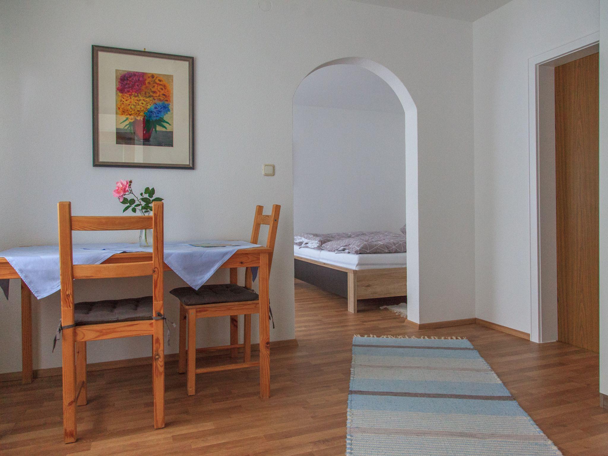 Ferienwohnung für 2 Personen, separater Eingang, Wohn- und Schlafraum mit Essbereich, Küche extra, Dusche mit WC, eigene Terrasse Nord- und Südseite, SAT-TV und WLAN, Bettwäsche und Handtücher inklusiv.