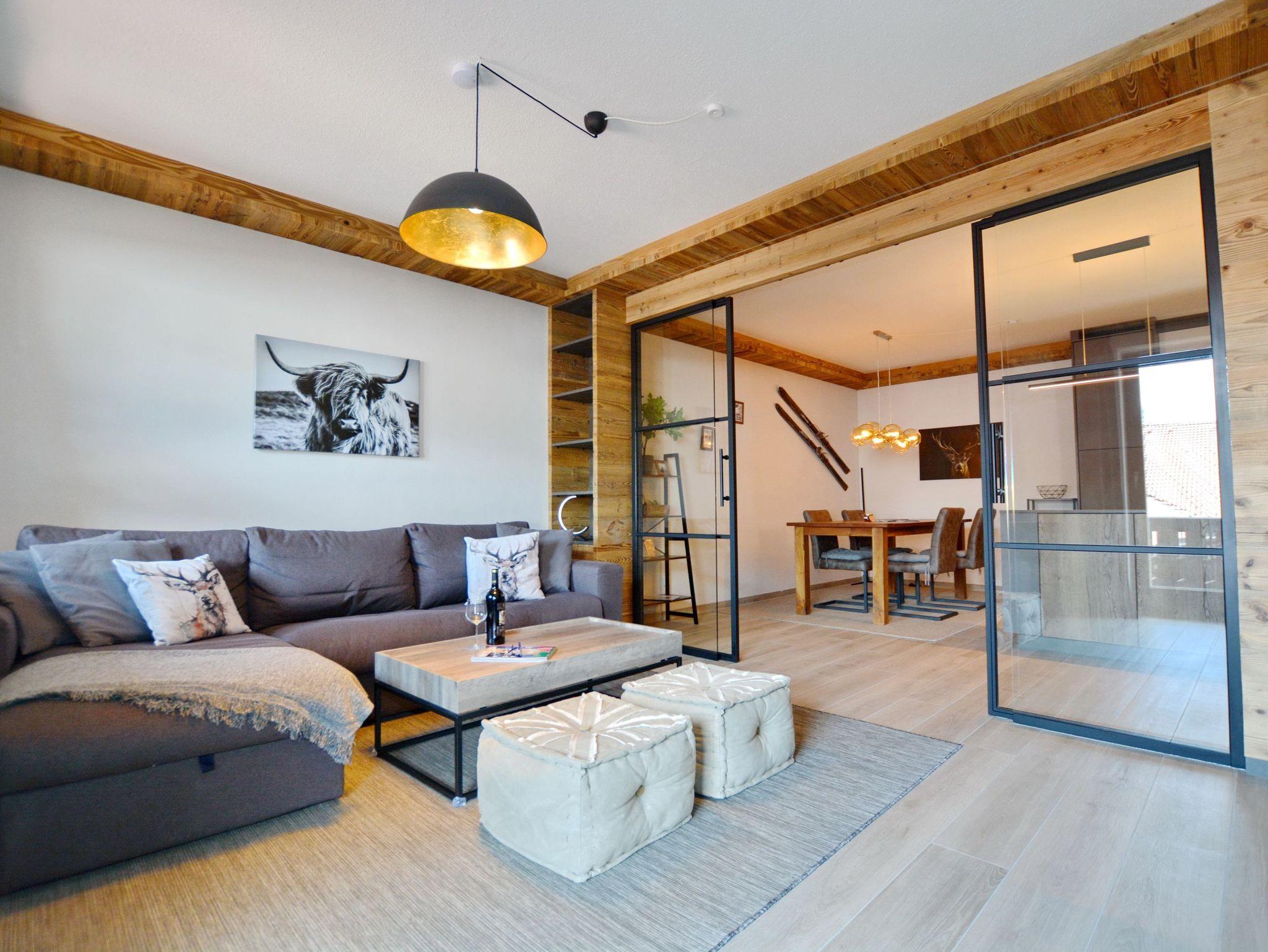 Diese stilvoll eingerichtete Ferienwohnung im 2. Obergeschoss bietet modernes alpenländisches Design, gemütlichen Komfort und einen Südbalkon mit Berg- und Burgblick. Freuen Sie sich auf ein separates Schlafzimmer mit Boxspringbett, ein helles Wohn-/Esszimmer mit Schlafsofa, eine voll ausgestattete Küche mit Stil sowie ein modernes Bad mit bodengleicher Dusche. WLAN, Bettwäsche, Handtücher und Parkplatz sind inklusive. Fahrradabstellplatz vorhanden. Nichtraucherwohnung, keine Haustiere.