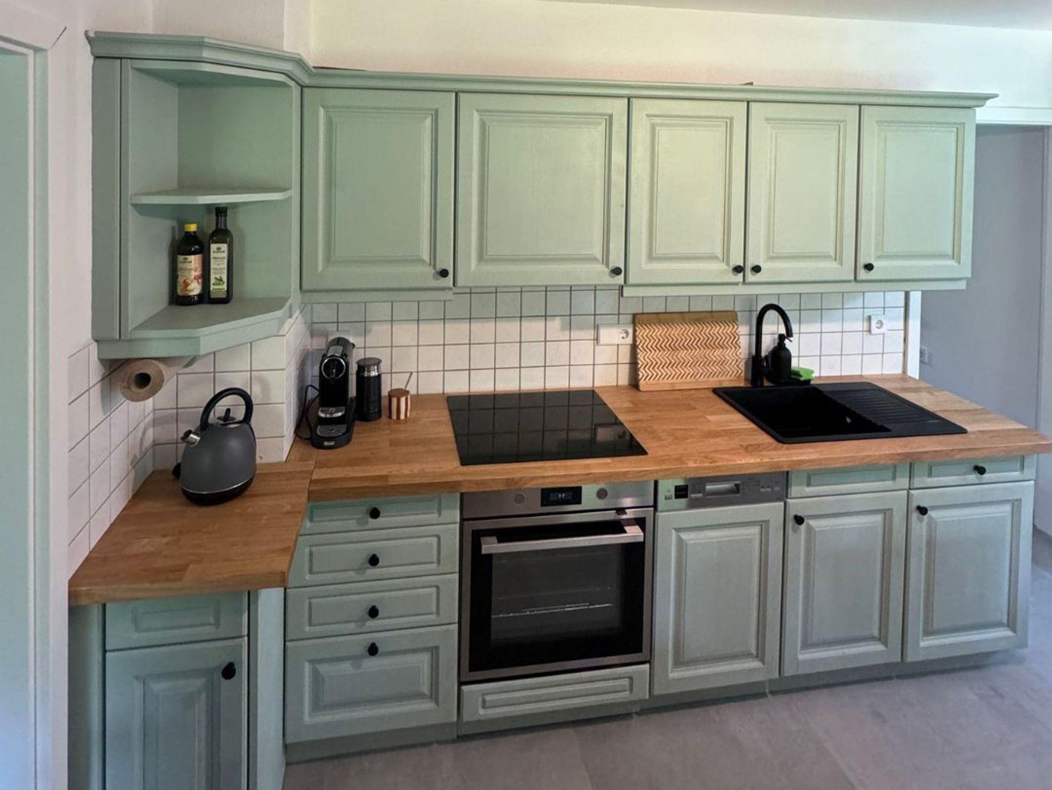 Voll ausgestattete Küche: Die Küche ist komplett funktional mit Herd, Ofen, Esstisch und allem, was Sie zum Kochen benötigen.