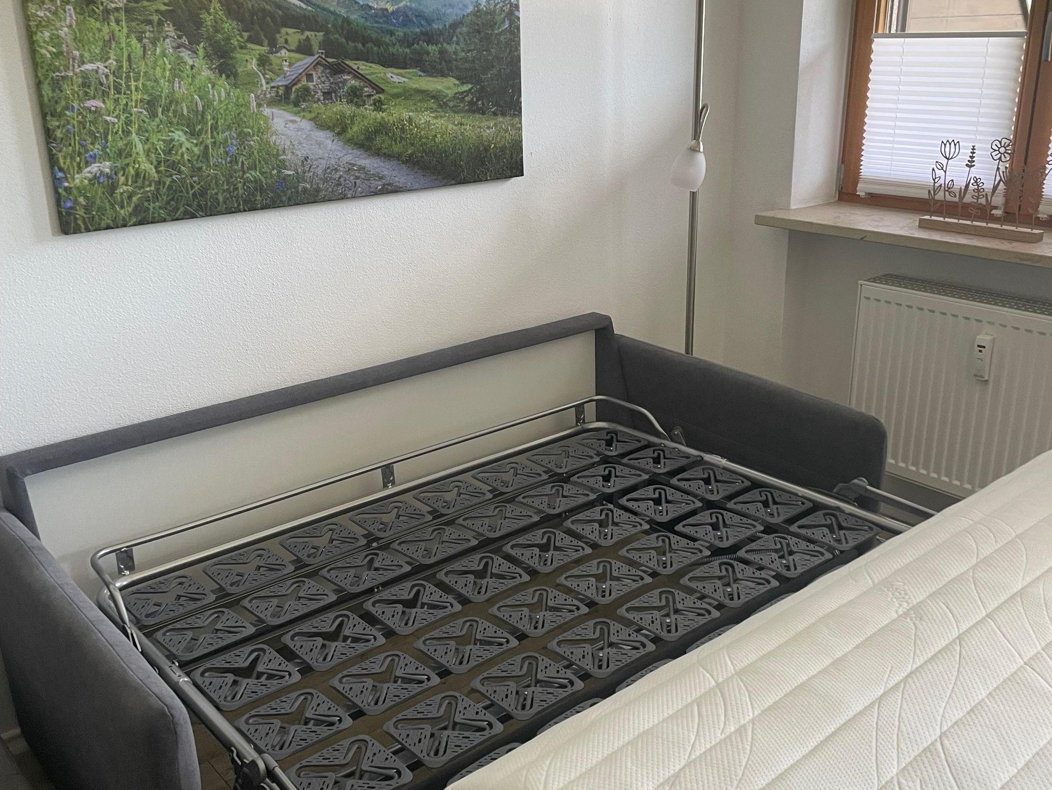 Die Wohnung verfügt über ein Schlafzimmer mit gemütlichem Doppelbett sowie ein Schlafsofa im Wohnbereich, das sich ideal für Kinder oder Freunde eignet. Im Schlafzimmer befindet sich ebenfalls ein TV. Sowohl der Fernseher im Wohnbereich als auch im Schlafzimmer verfügen über Netflix Zugang und normales TV Programm.