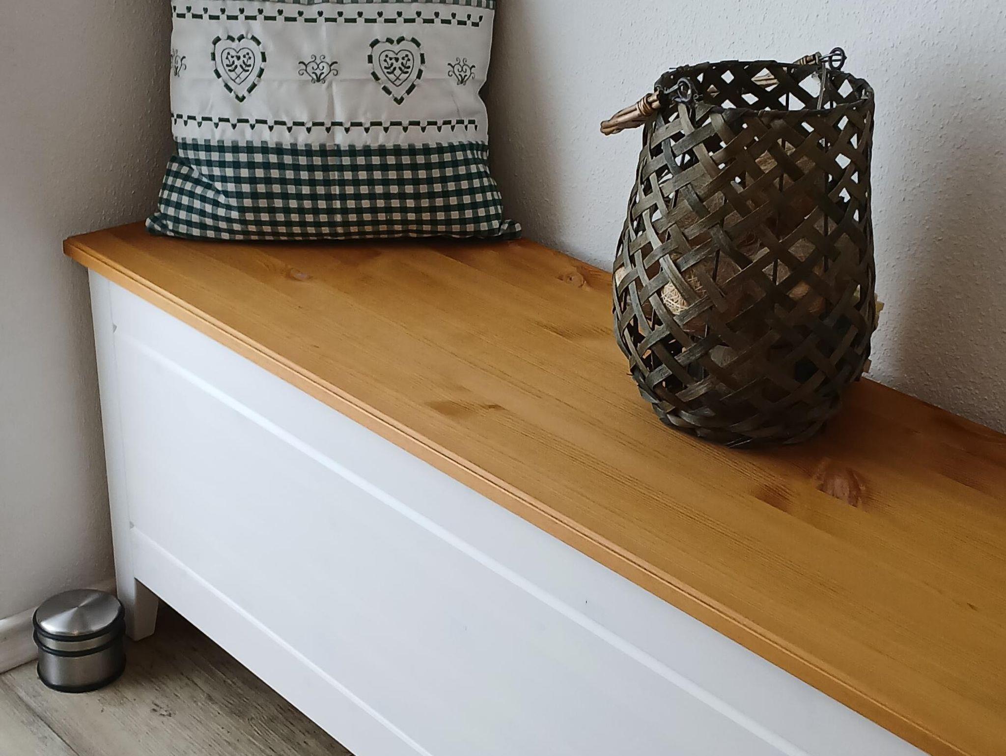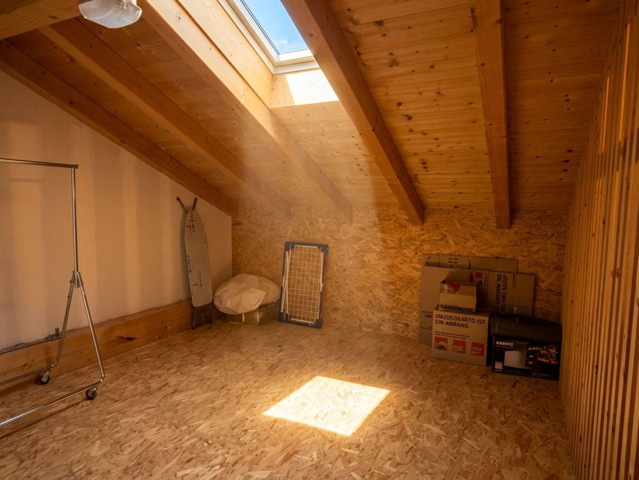 Im Schlafzimmer steht ein großer Schwebetürenschrank mit viel Platz für Kleidung und Gepäck zur Verfügung. Für Gäste auf dem Schlafsofa gibt es im Wohnbereich praktische Aufbewahrungsmöglichkeiten für Bettzeug und kleinere persönliche Dinge. Weitere Koffer oder sperrige Gegenstände können bei Bedarf auch auf dem trockenen Dachboden verstaut werden.