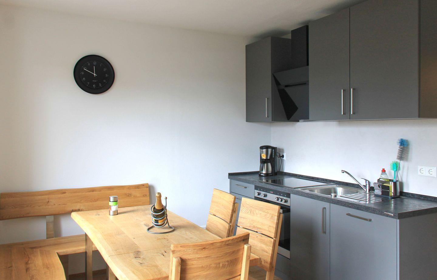 Sowohl im Erd- als auch im Obergeschoss erwartet Dich eine komplett ausgestattete Küche mit Herd, Backofen, Spülmaschine, großem Kühlschrank und allen wichtigen Küchenhelfern. Am massiven Holztisch mit Eckbank finden bis zu zehn Personen Platz – perfekt für gemeinsame Mahlzeiten oder lange Spieleabende.