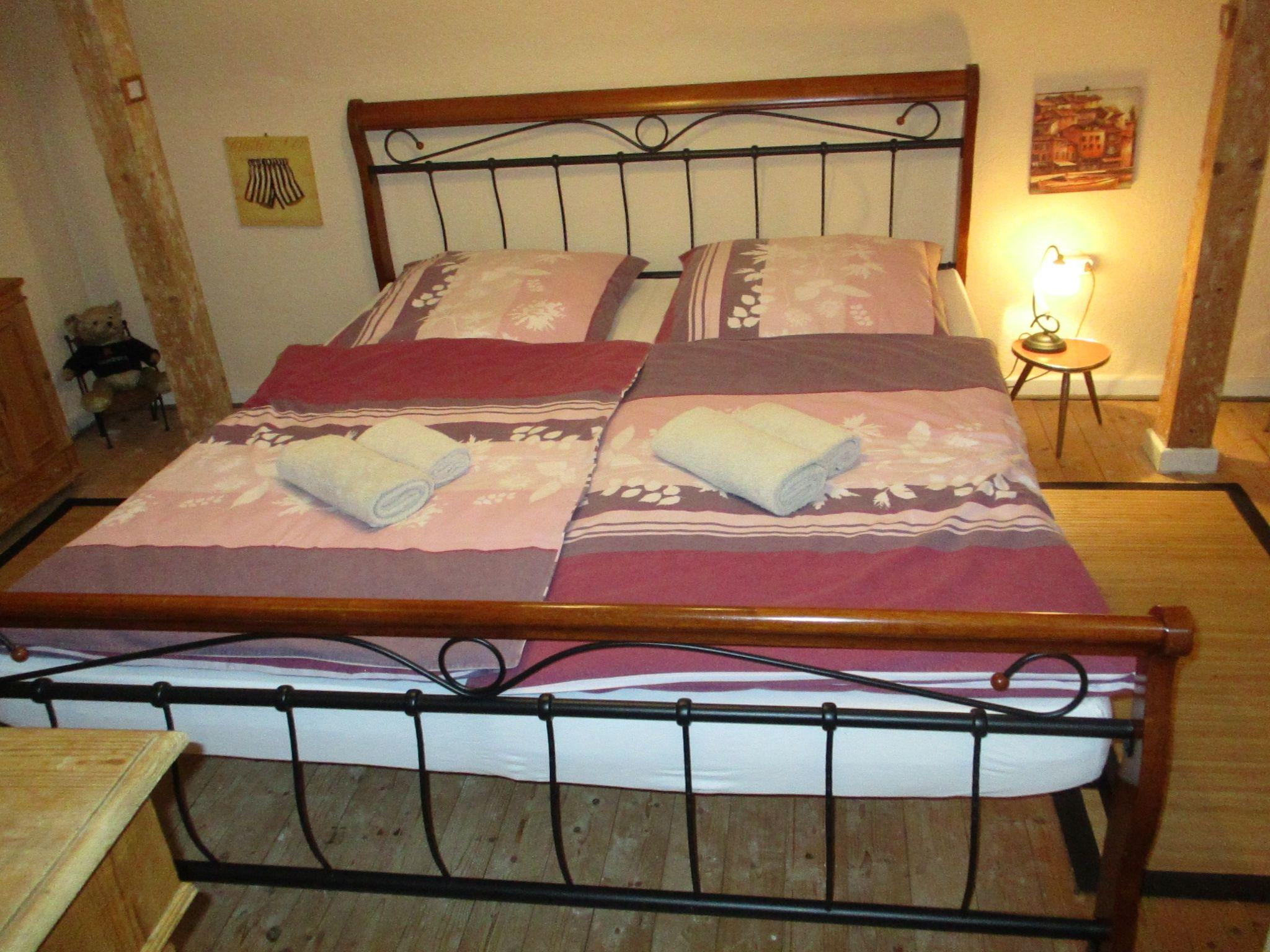 The apartment of around 70m2 is on the first floor. It has been renovated and furnished with charming antiques in a rustic style. The three bedrooms provide ample space for all guests. The first two bedrooms each have a comfortable double bed, while the third has a kingsize bed. The cosy living and dining room includes a fully-equipped built-in kitchen, with all the necessary kitchen utensils, a toaster, a kettle, an electric stove with an oven and a fridge with a freezer compartment. A dining table invites you to enjoy dining together, as well as sociable gatherings. A sofa with satellite TV and an integrated DVD player invites you to relax. The shower room with a WC rounds off the accommodation.
