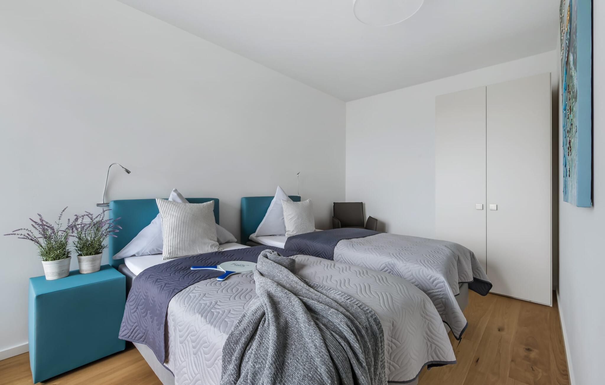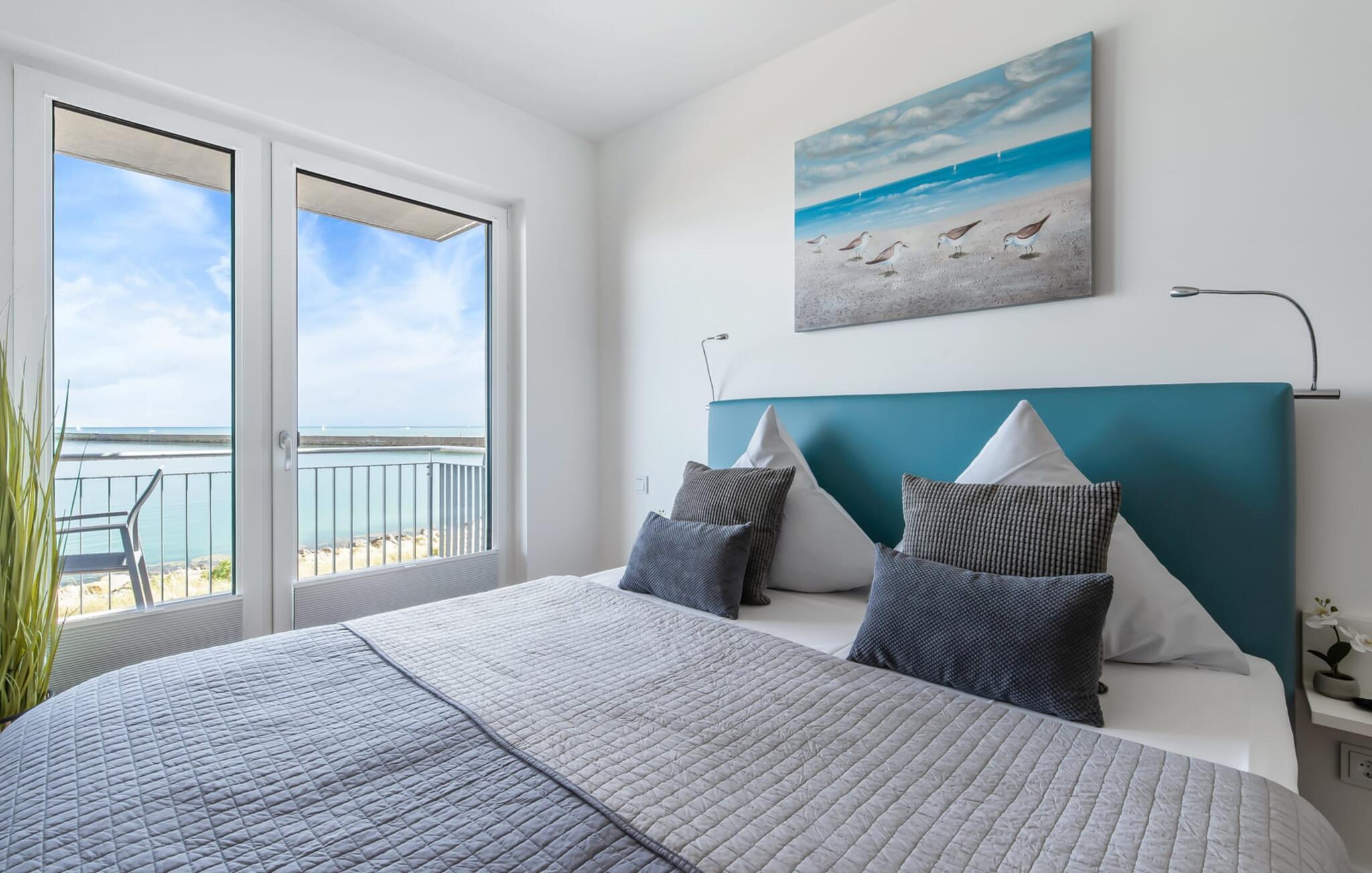 De to soveværelser er hver udstyret med boksmadrasser. I kan vælge mellem dobbeltsengen med en tilstødende balkon og fænomenal havudsigt og det andet soveværelse med to enkeltsenge også med fuld havudsigt. Også her har I vindueselementer fra gulv til loft til udsyn, når I ligger ned.