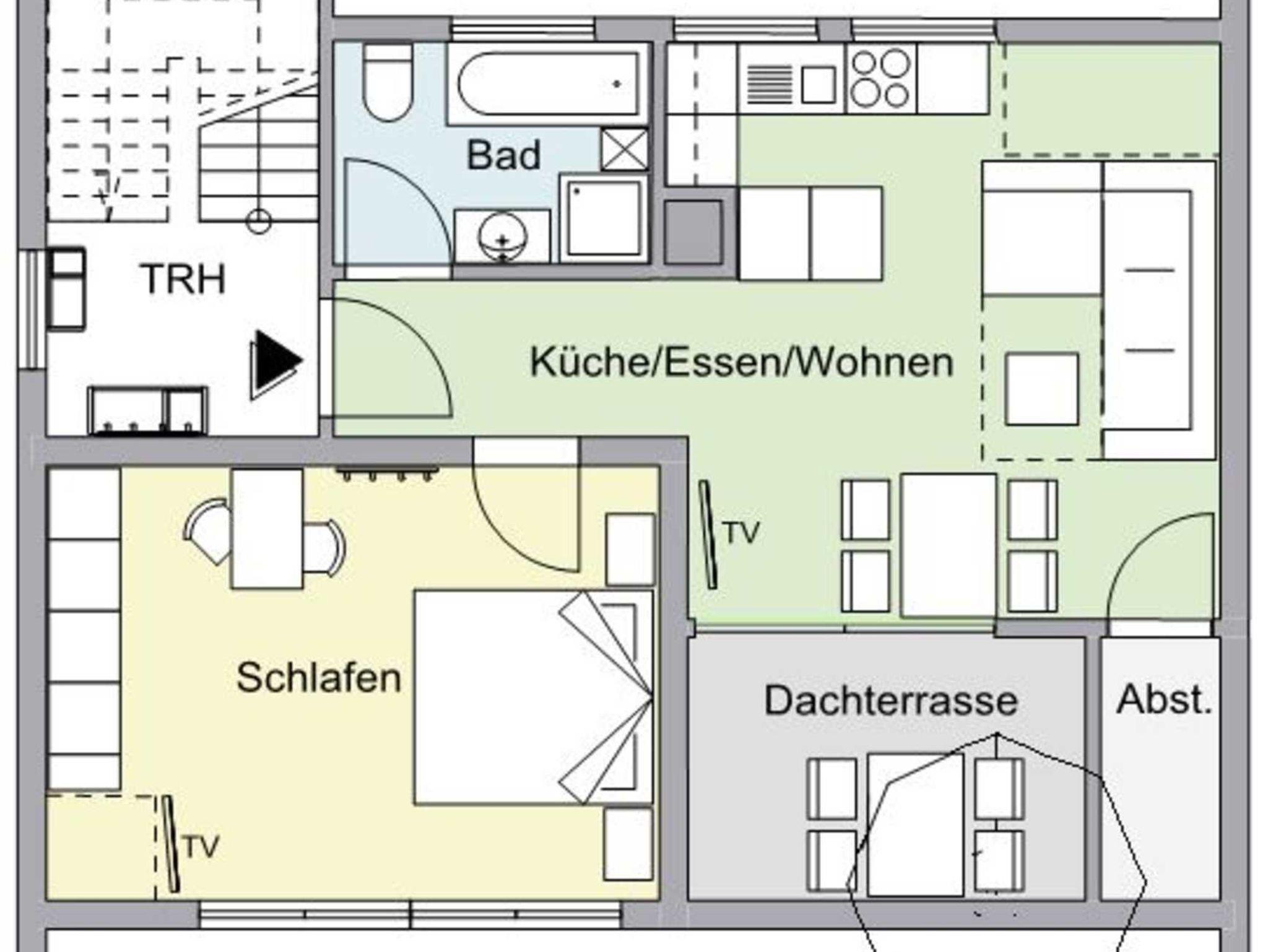 - einen Wohn-Essbereich mit TV, Einbauküche und Zugang zur Dachterrasse mit tollem Seeblick
