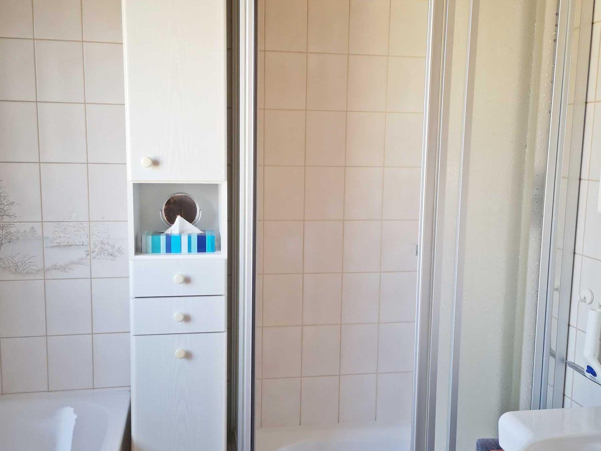 - OG-Wohnung: Badezimmer mit Badewanne, Dusche und Waschbecken sowie ein separates WC