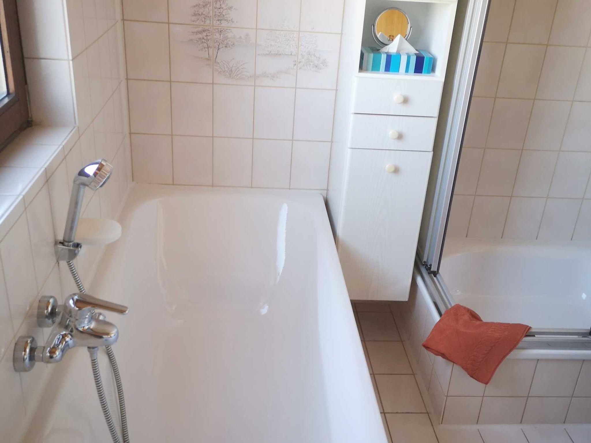 - großes Badezimmer mit Badewanne, Dusche, WC und Fenster