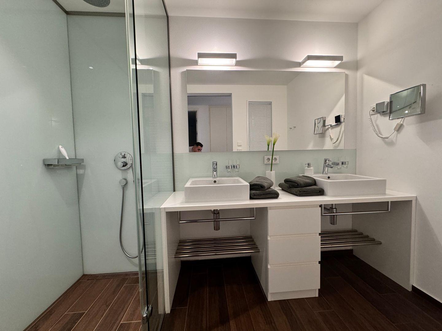 Das Badezimmer ist modern und verfügt über eine bodengleiche Dusche, Warmwasser, Waschbecken, WC sowie einen Spiegel und einen Kosmetikspiegel. Ein Gäste-WC ist ebenfalls vorhanden. Haartrockner, Waschmaschine, Trockner und Wäscheständer sind gemeinschaftlich nutzbar. Die Bodenbeläge aus Vinyl in Wohn- und Schlafzimmer bieten ein angenehmes Wohngefühl.