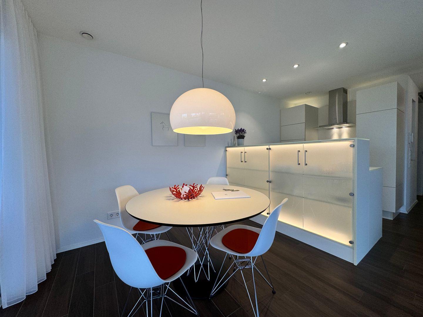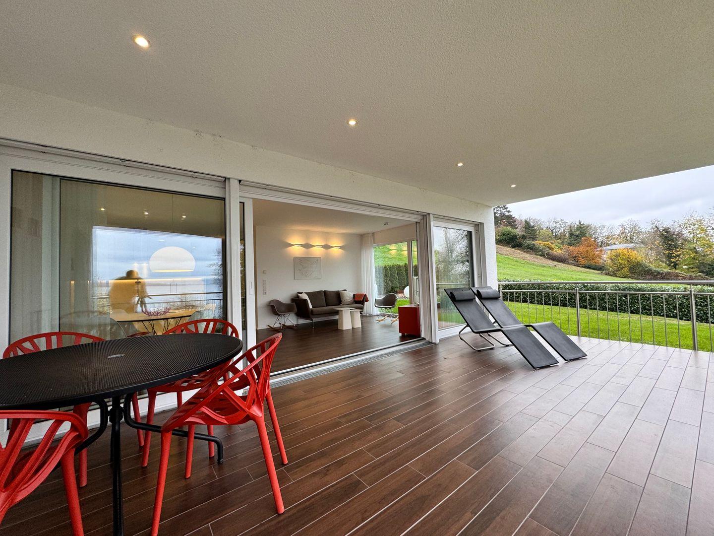 Herzstück der Unterkunft ist das offen gestaltete Wohn- und Esszimmer mit direktem Zugang zum überdachten, geschlossenen Balkon (25 m²). Von hier aus genießen Sie einen außergewöhnlich guten Seeblick sowie Ausblicke auf die umliegende Landschaft und den Garten. Die Balkonmöblierung mit Sonnenliegen und weiteren Gartenmöbeln lädt zum Verweilen und Genießen der natürlichen Umgebung ein. Alle Fenster sind mit Sichtschutz versehen und sorgen für Privatsphäre.