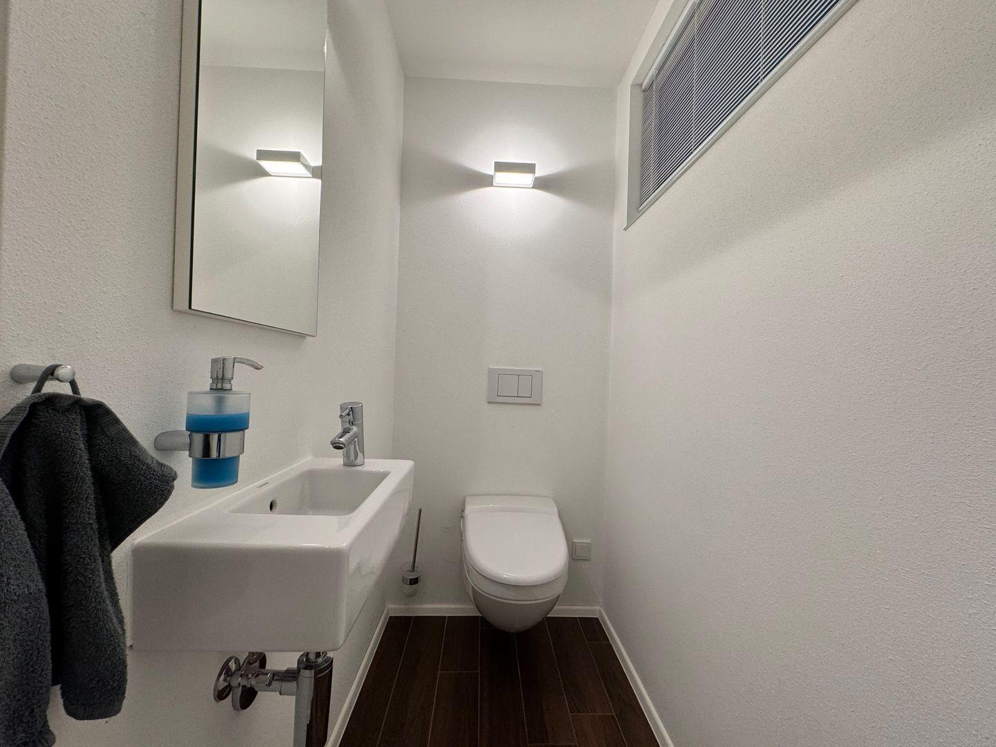 Das moderne Badezimmer verfügt über eine bodengleiche Dusche, WC, Waschbecken, Spiegel, Kosmetikspiegel und Haartrockner. Zusätzlich steht Ihnen ein separates Gäste-WC zur Verfügung. Eine Gemeinschaftswaschmaschine und ein gemeinschaftlich genutzter Trockner sorgen für zusätzlichen Komfort während Ihres Aufenthalts. Der gesamte Wohnbereich ist durch eine Kombination aus Zentralheizung und Fußbodenheizung angenehm temperiert.