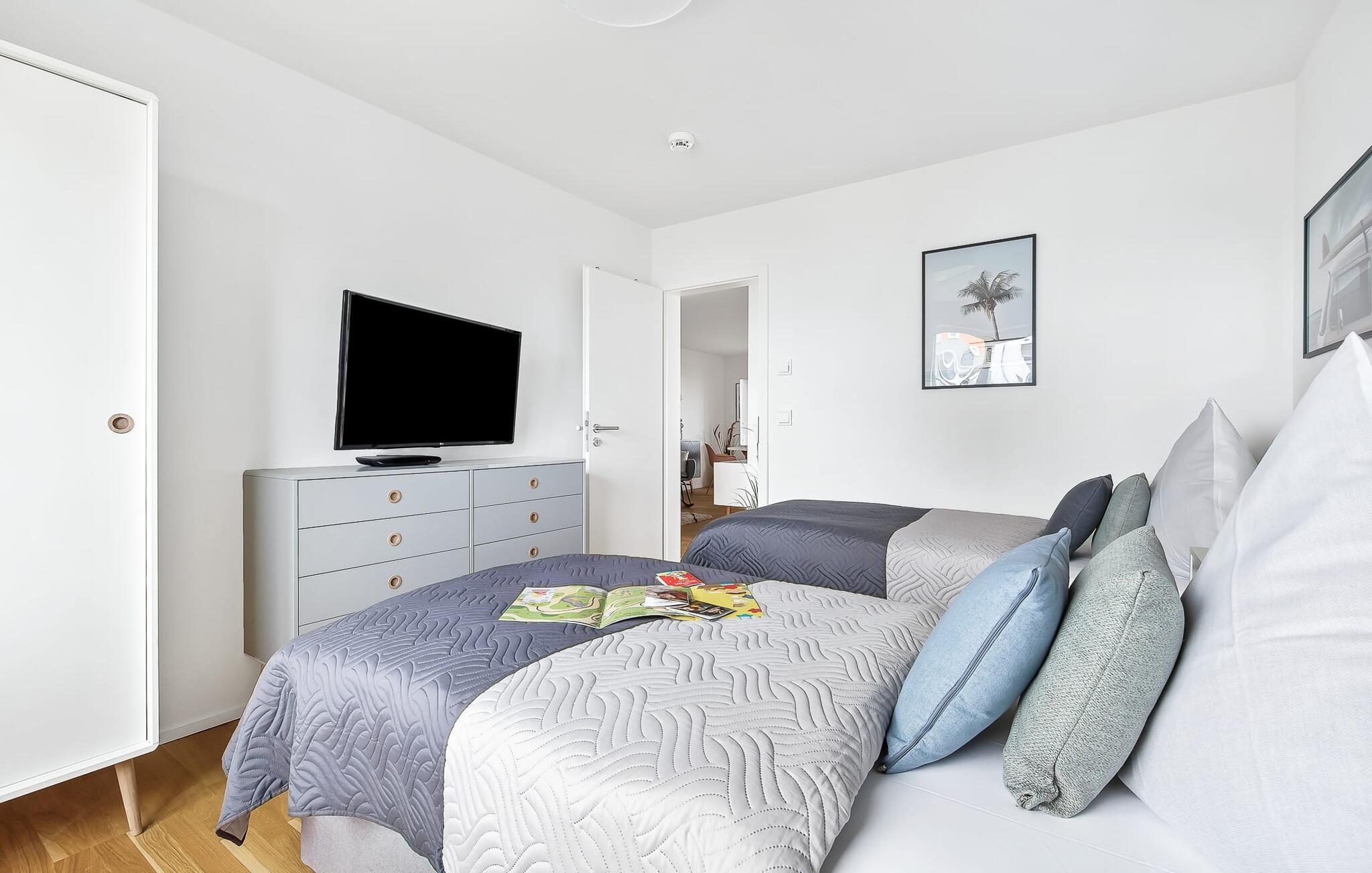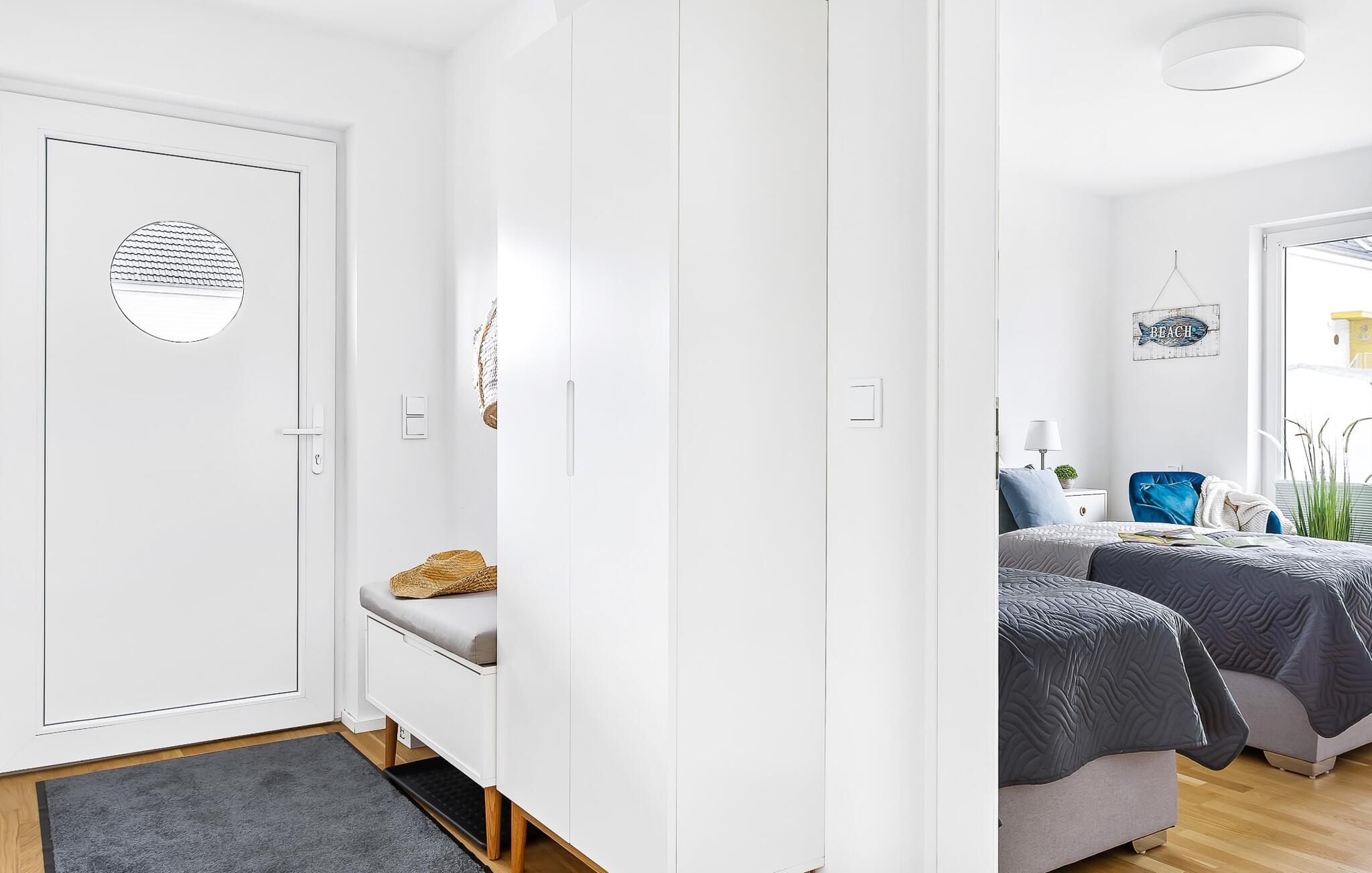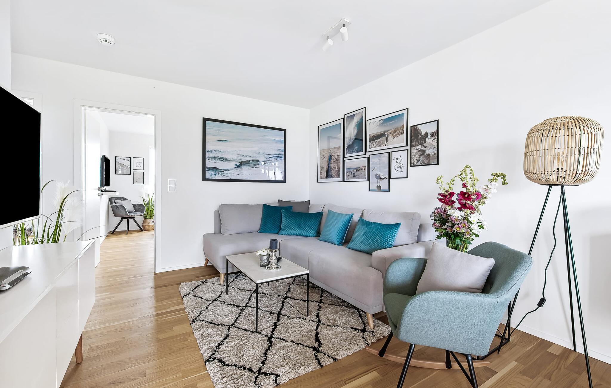 Ferielejligheden MeerVergnüge har med rette sit tvetydige navn! For I kan ikke have det MERE sjovt med jeres familie på ferie. MeerVergnügen ligger i stueetagen, med direkte adgang til haven via de to overdækkede solterrasser, hvorfra man delvist kan se Østersøen og havnen. Ren sommer- og kystfølelse er dagens orden her! Træd ind i den kærligt og komfortabelt møblerede, åbne stue/spisestue og føl jer godt tilpas fra første øjeblik. Sofaen, som byder på ekstra soveplads, og gyngestolen inviterer til at dase og se tv. Det tilstødende køkkenområde, udstyret med alt, hvad amatørkokken har brug for, vækker lysten til at lave mad sammen. I kan derefter spise sammen enten på den tilstødende, vindbeskyttede terrasse eller ved det moderne spisebord. Denne beslutning træffes normalt af vejrguderne. På den store terrasse foran stuen/alrummet finder I en Weber grill og en spisegruppe og på den anden en behagelig strandstol. Begge terrasser forudser hyggestunder ved Østersøen. Det ene soveværelse er udstyret med en dobbeltseng med boxmadrasser, fjernsyn og komfortabel lænestol. Det andet soveværelse er udstyret med to enkeltsenge med springmadrasser, et fjernsyn og også en komfortabel lænestol. Fra begge har I en fantastisk udsigt over havnen og I kan også se solnedgangen. Badeværelset er en lille wellness-oase! Et spabad og en infrarød sauna forsøder også de dage, hvor vejret ikke er rigtig godt og bliver nordisk. Så fremtryller pejsen i stuen en hyggelig stemning, som I kan understrege med musik fra internetradioen. Havnydelse er ikke mulig. Vores favoritsted: nyd lækre grillspecialiteter og nyd dem på terrassen i solskinnet... Bemærk venligst: OstseeResort Olpenitz er meget populært, og der bygges fortsat i parken. Ikke desto mindre kan I se frem til en 5-stjernet standard og et førsteklasses ophold. Byggeaktiviteterne kommer ikke til at forstyrre jer på ferien, og derfor gives der ikke yderligere afslag i prisen.