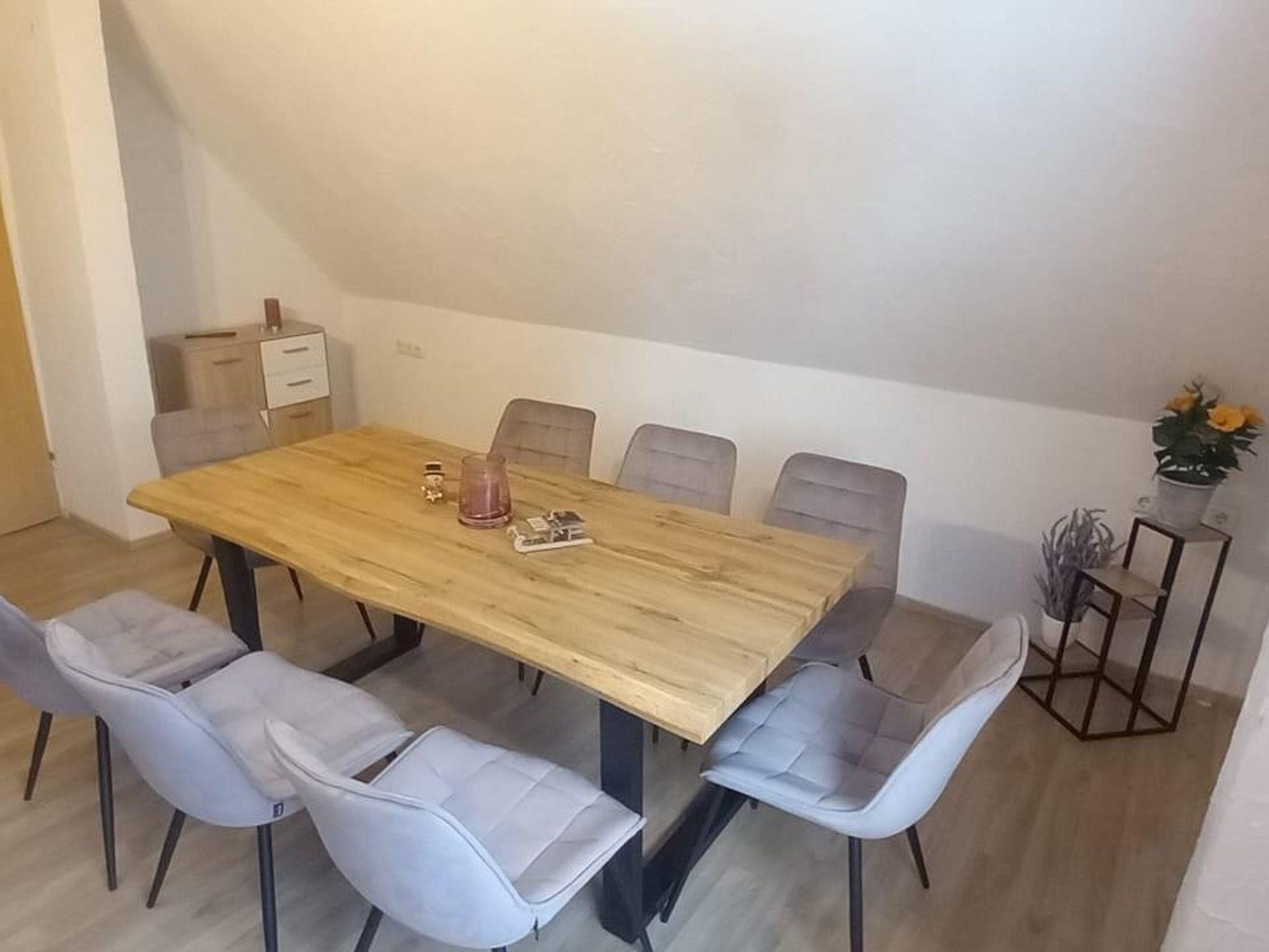 Das Wohnzimmer im 1. Stock hat ein gemütliches Sofa mit einem großen Smart TV, einen großen Tisch für 8 Personen, einen Schwedenofen und eine Leseecke.