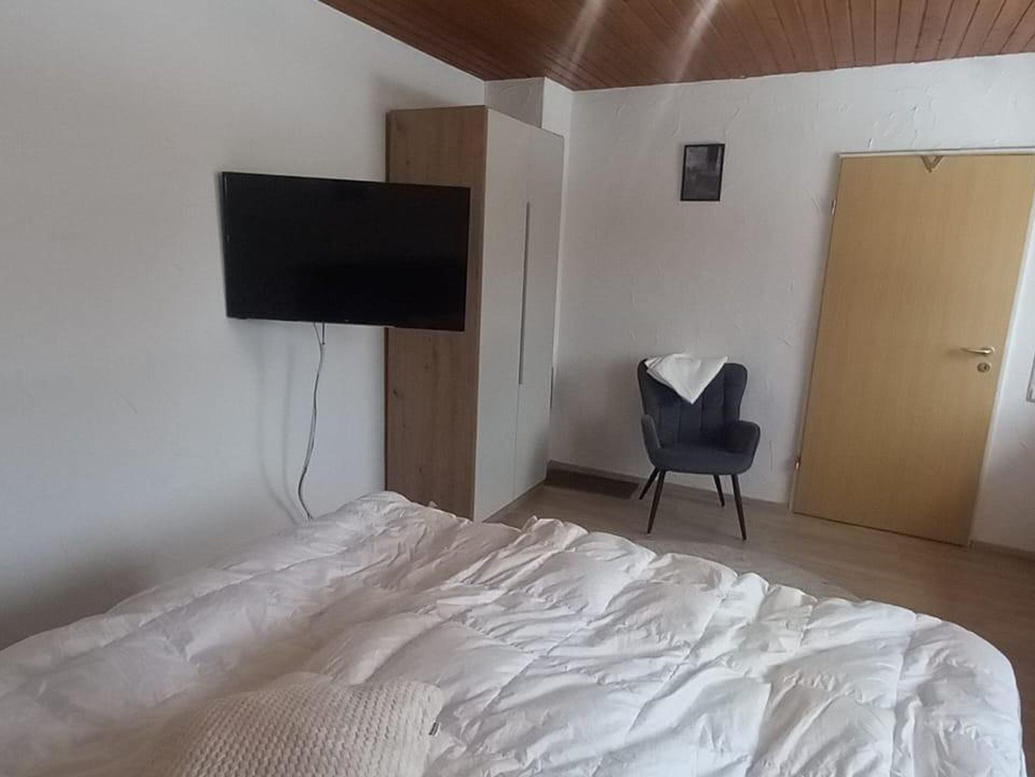 Schlafzimmer 1 im Erdgeschoss mit Boxspringbett 1,80 und ausklappbaren TV, Kleiderschrank und Sessel