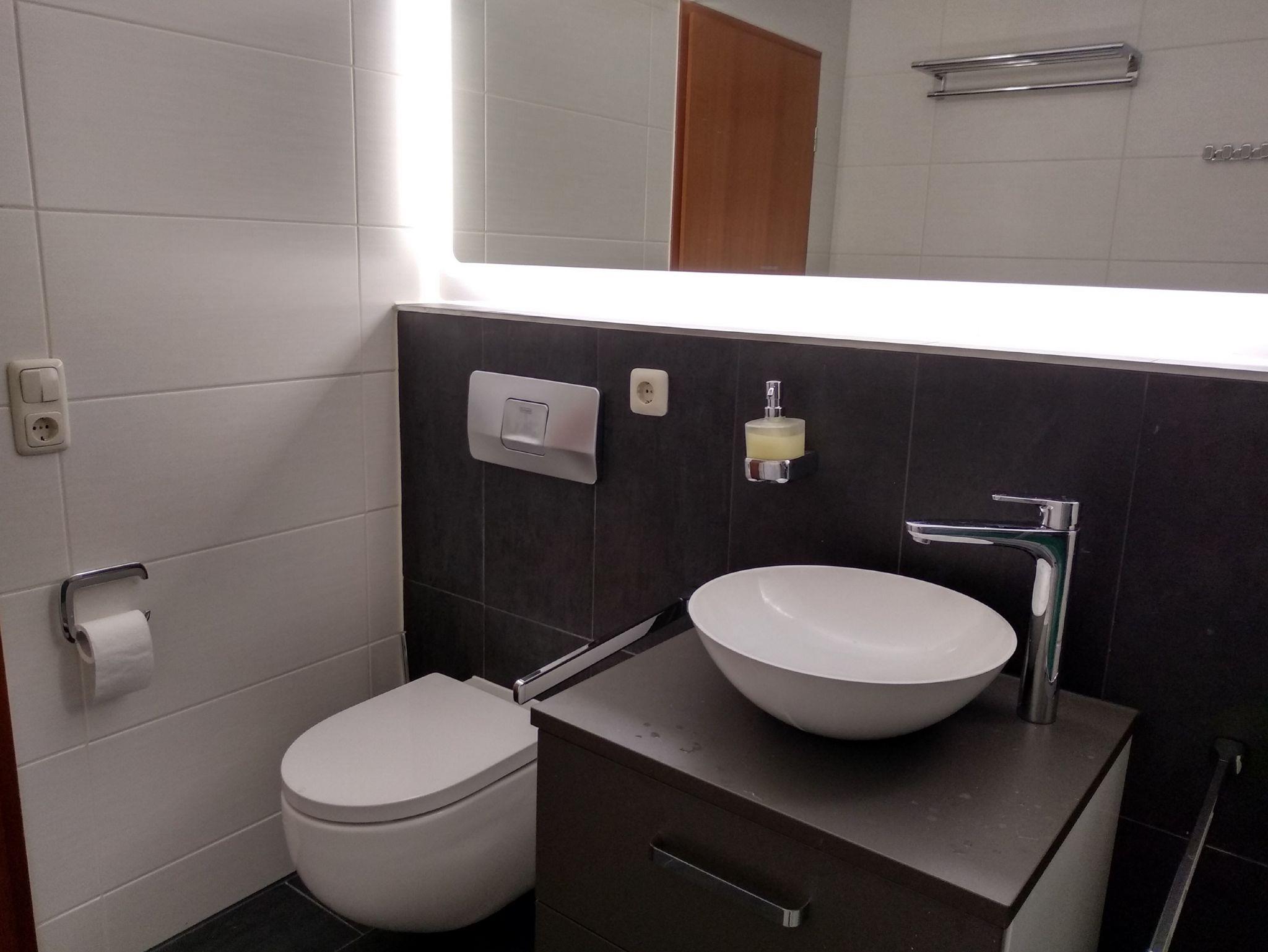Treten Sie bitte ein: Im großen Eingangsbereich erwartet Sie nach einem ausgefüllten Tag unsere neue Infrarotsauna, mit 2 Sitzplätzen, Lichttherapie und die Möglichkeit bei sanfter Musik abzuschalten. Nach dem Saunieren können Sie sogleich auf den großen Balkon gehen oder sich in dem neu gestalteten Bad in der Walk-In Dusche erfrischen.