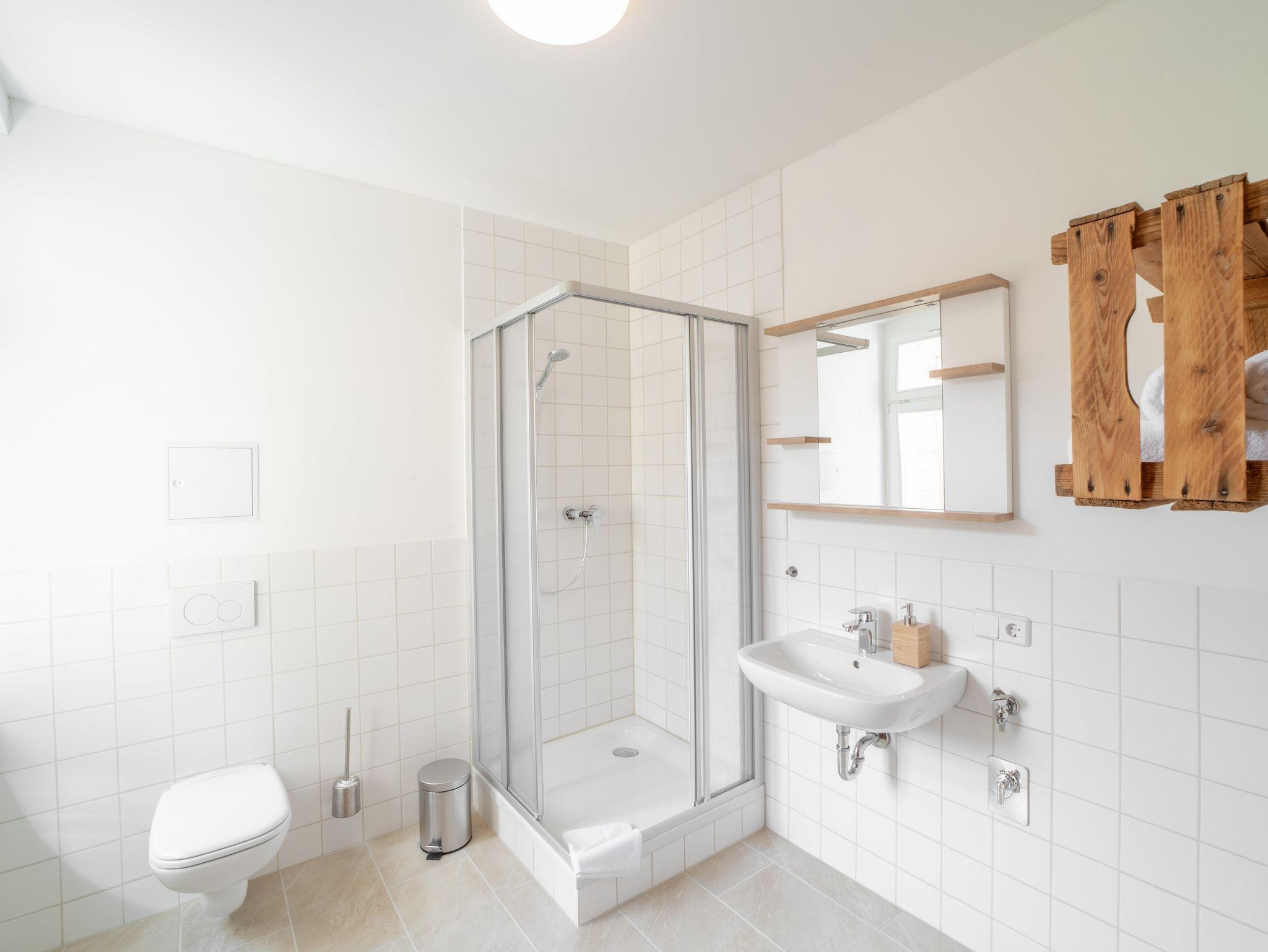 Im angrenzenden geräumigen Badezimmer mit Dusche finden Sie neben weiterem Stauraum alles Notwendige: Frische Handtücher in zwei Größen, Toilettenpapier und Seife.