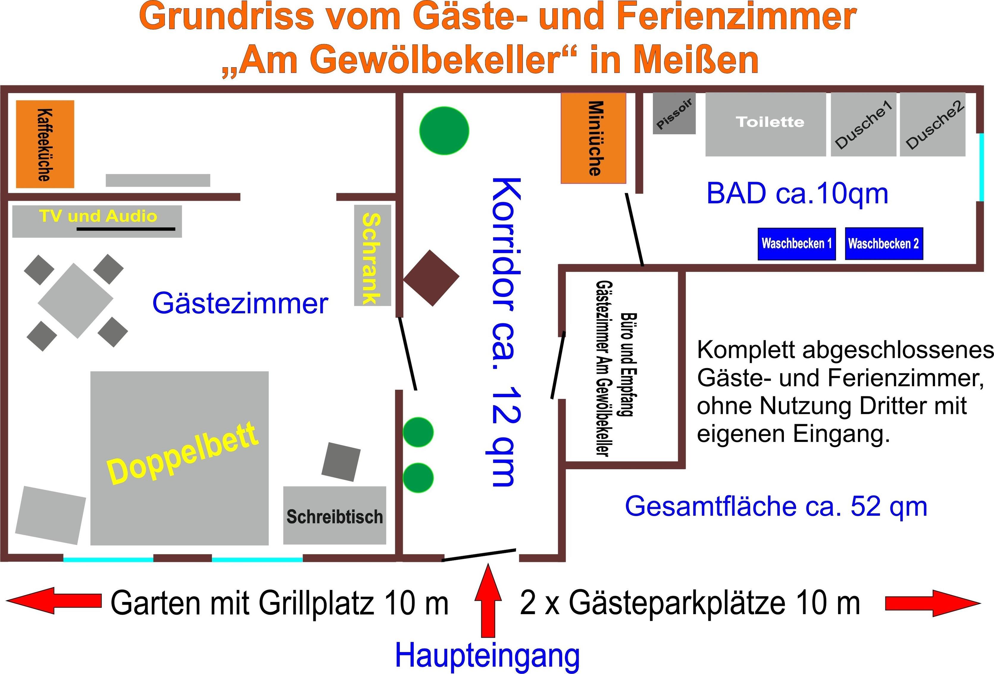 Die 54 qm große Gäste- und Ferienzimmereinheit besteht aus einer separat abgeschlossenen Einheit mit eigenem Eingangsbereich. Vom großen Korridor geht dann das Gästezimmer mit kleiner Kaffeküche ab. Im geräumigen ca. 30 qm großen Wohn- und Schlafzimmer ist alles vorhanden was der Gast benötigt. Großes Doppelbett, Schreibtisch, Sitzecke, Kleiderschrank mit Tresor, TV und Radio, sowie eine moderne Klimaanlage. Durch eine Glastür kommt man zur kleinen Kaffeküche. Weiter vom Korridor steht dem Gast eine zweite kleine Küche mit Kühlschrank zur Verfügungg, wo dann das große eigene Bad , mit zwei Duschen, zwei Waschbecken ein WC und ein Pissoir ausgestattet anschließt. Kostenloses schnelles WLan und ein gesicherter Parkplatz für Fahrräder, Motorrad und PKW sind für unsere Gäste ebenfalls vorhanden.