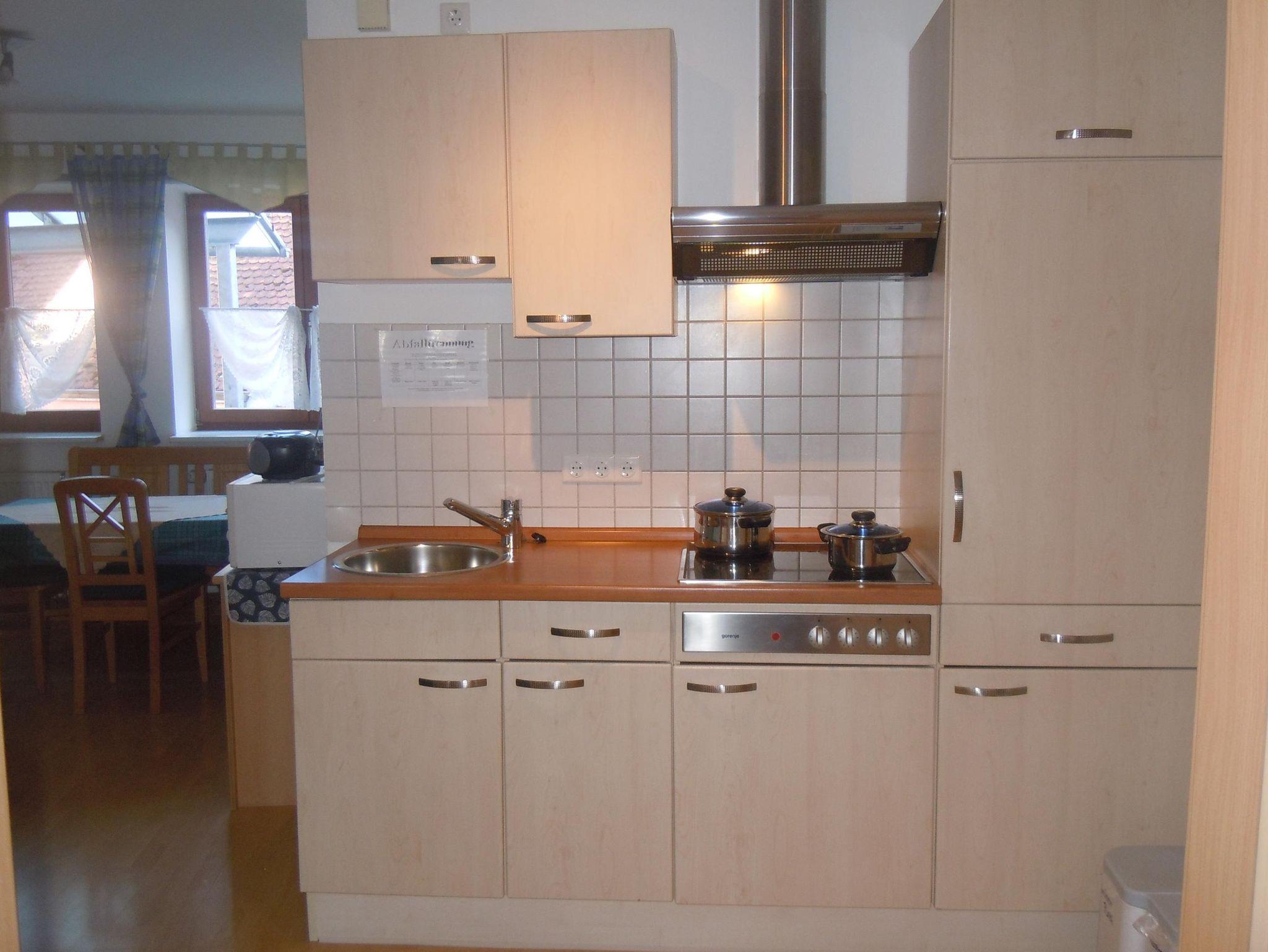 45qm für 3 Personen Ferienwohnung 2 barrierefrei ist über einen stufenlosen, separaten Eingang zu erreichen. Sie besteht aus einem Schlafraum mit Doppelbett (Einzelstellung der Betten möglich), Bad und einem Wohnraum mit geräumigem Schlafsofa, komplett eingerichteter unterfahrbarer Küchenzeile (Kaffemaschine, Wasserkocher, Brotschneidemaschine u.v.m.). Auch Shampoo, Duschgel, Bodylotion und Seife stehen für Sie bereit.