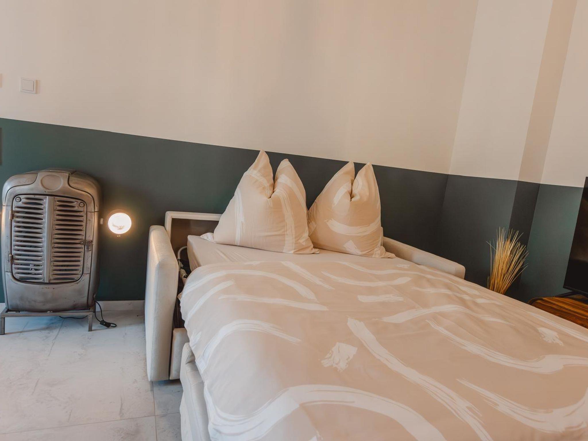 *Offener Wohn-/Essbereich mit gemütlichen Dauerschläfersofa und stilvollen Cocktailsesseln laden zum Verweilen ein.