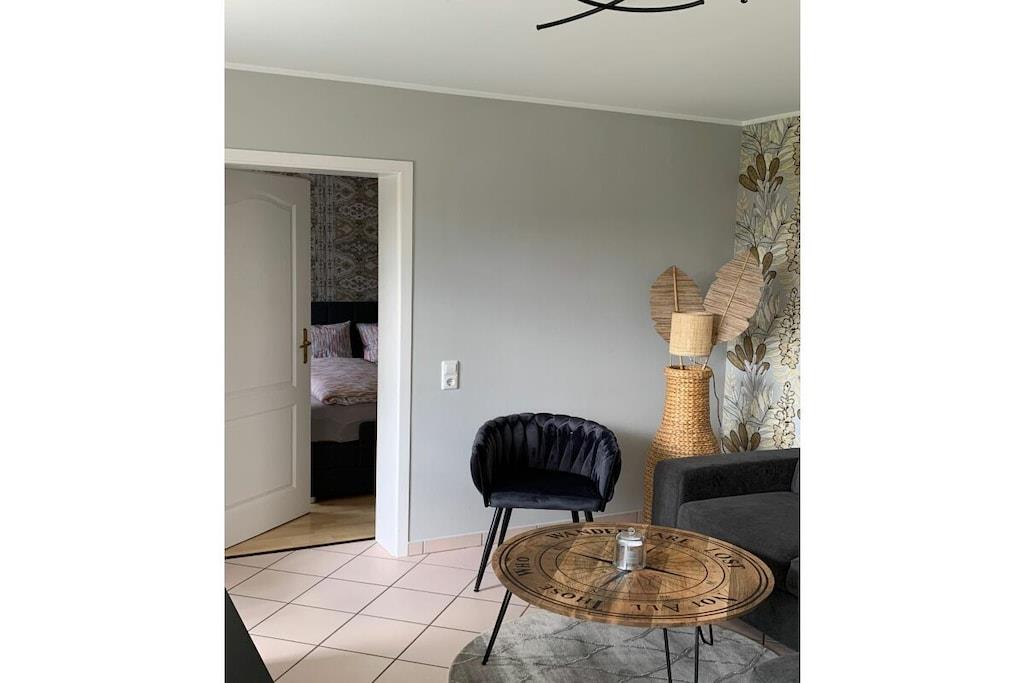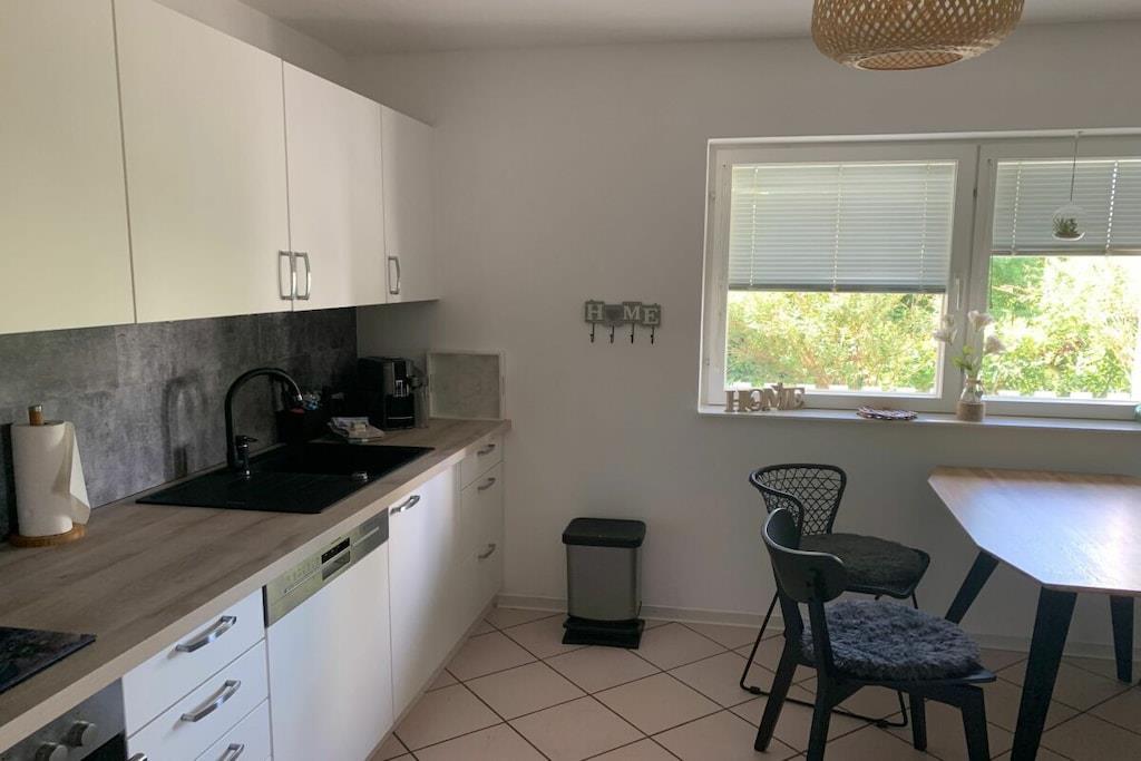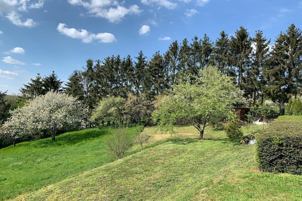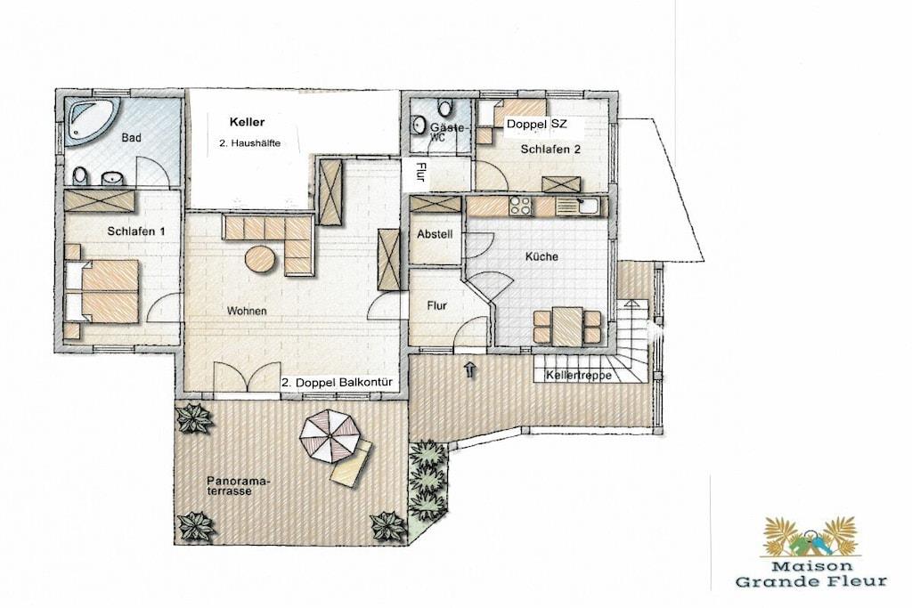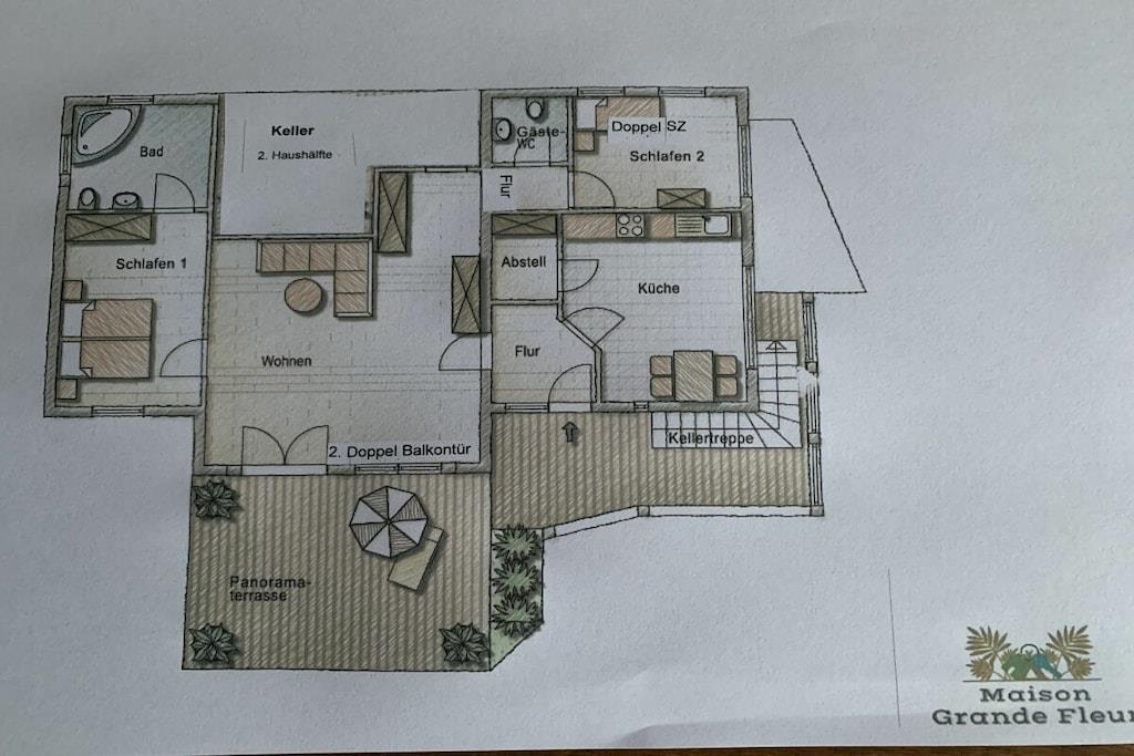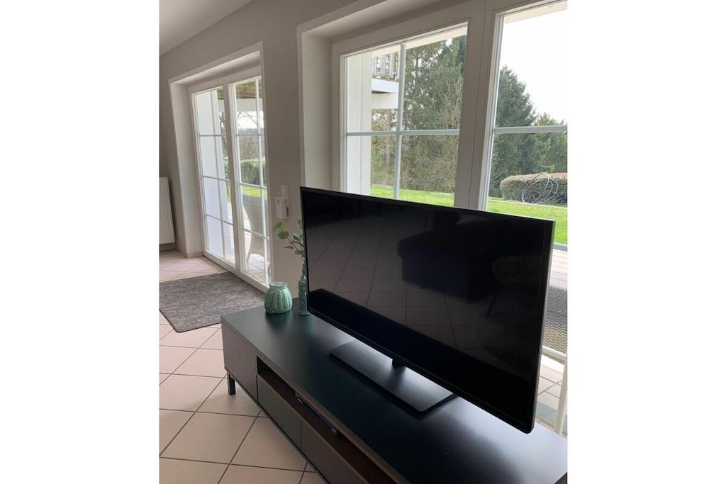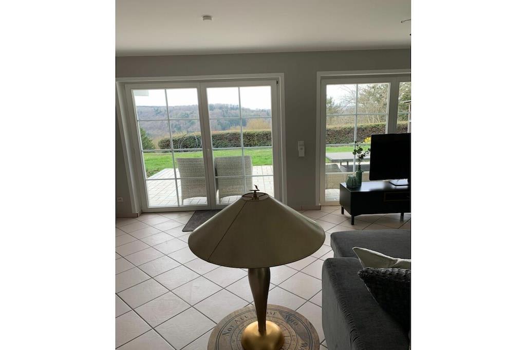 Lichtdurchflutet präsentiert sich das coole Wohnzimmer mit 4 bodentiefen Fenstertüren mit Ausblick über die Terrasse ins Grüne, Kylltal und der Silhouette von Bitburg. Möbliert mit Boxspringsofa mit Couchtisch, Lowboard mit gr. TV, Lese- und Schreibgedönsecke, Sessel und verschied. Tischchen Wohnküche möbliert mit franz. Bistrocharakter, moderner EBK ( Cerankochfeld, Backofen, Miko, Kaffeeset, Mixer schönes Geschirr, Abstr., etc.), Kochen und ausgiebiges Frühstück im Urlaub werden zum Vergnügen. SZ I: Masterbedroom mit elektr. Boxspringbett 1,80 x 2,00 m und Bad en suite (Rundeckbadewanne mit Dusche, WC, gr. LED-Spiegel, Waschtisch, Fenster, Ablagen SZ II: mit Lederboxspringbett 1,60 x 2,00 m mit kl. Vorflur und GÄ-WC nebenan Alle Räume werden mit bequemem Mobiliar, Design-/Antikklassikern und kunstvollen Objekten bestückt. Die Kombination der modernen, klaren Form- und Farbsprache mit hyggeligen Charakterteilen spendet somit eine wohnliche gemütliche Behag-lichkeit und Wärme. Für Unterhaltung sorgen 2 Flachbild-TV im Wohnzimmer und Schlafzimmer, Magenta TV, schnelles WLAN, Musikanlage usw. Der Mehrwert des Grand Fleurs ist die große, sonnige teilüberdachte und fast uneinsehbare Panoramaterrasse mit Rasenfläche, Blumenbeet und Fernblick in Süd-/Westlage. Mit dem Holzchalet im Rücken, dem wundervollen Grün und Landschaft mit vielfältigem Vogelgezwitscher jedes Naturlieb-haberherz höher schlagen. Hier will man einfach nur am Haus relaxen will oder auf den schönen Terrassenmöbeln die Sonne genießen.