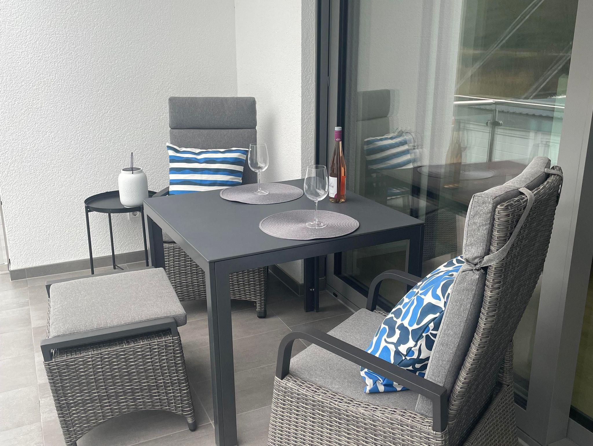 • Großer Sonnenbalkon mit Sitzgelegenheit und Tisch
