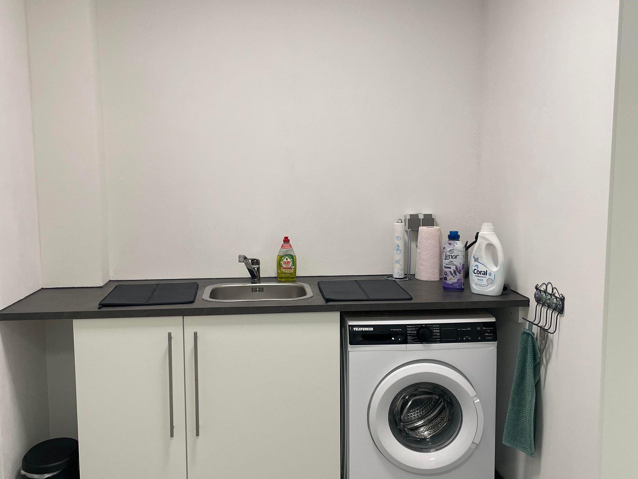 • Offene, voll ausgestattete Küche mit Kühl-Gefrierkombination, Backofen, Vierplatten-Induktionskochfeld, Mikrowelle, Spülmaschine, Wasserkocher, Toaster und Filter-Kaffeemaschine