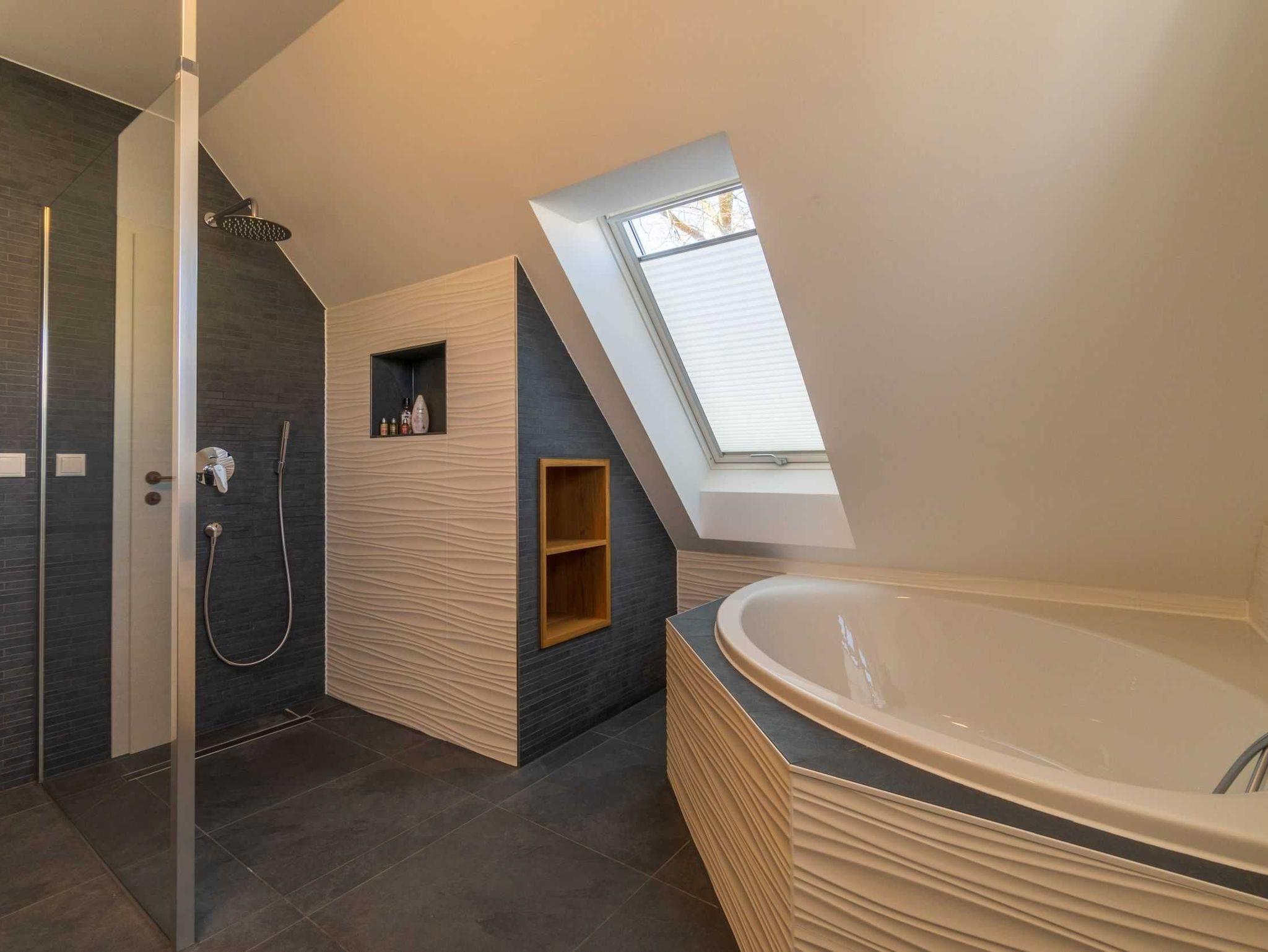 Das große geschmackvoll gestaltete Bad ist mit einer bodentiefen Dusche sowie einer Eckbadewanne ausgestattet. Außerdem befindet sich auch im Obergeschoß ein Gäste WC.