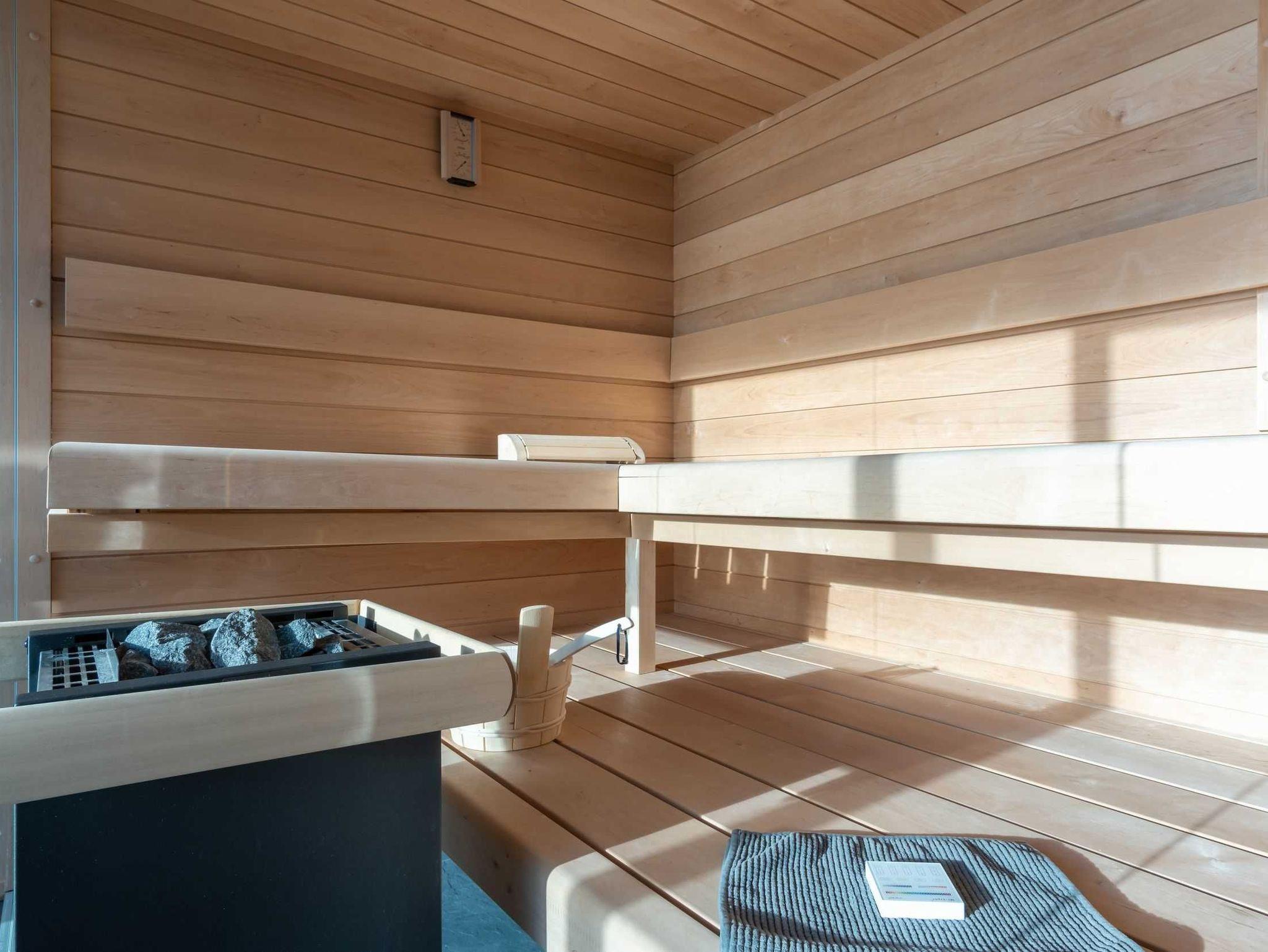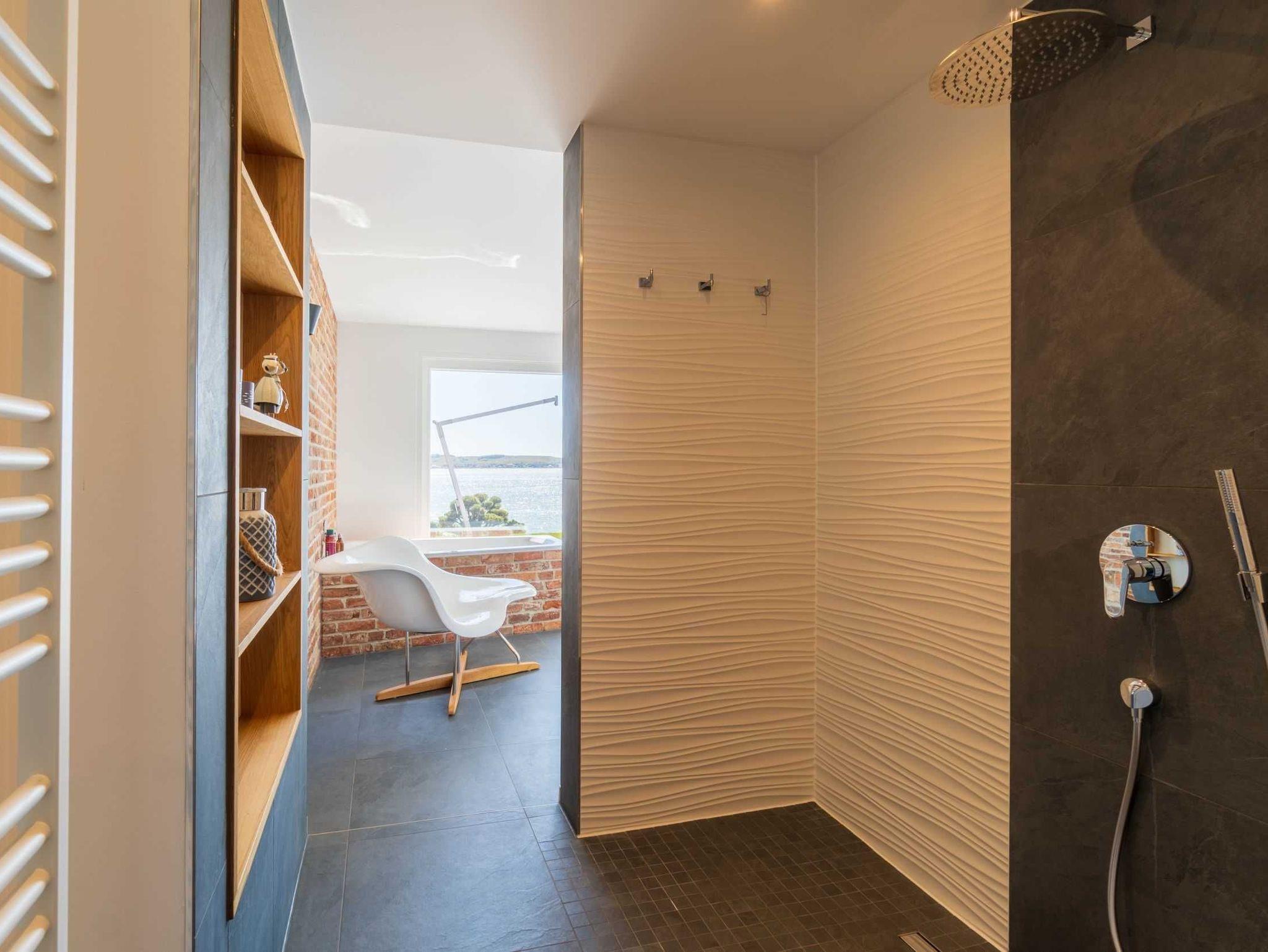 Hinter dem Essbereich befindet sich eines der Highlights, der Wellnessbereich. Genießen Sie vom Whirlpool den Blick auf den Rügischen Bodden (ab Herbst auch in Ihrer Sauna). Im Wellnessbereich steht Ihnen eine Dusche und ein WC zur Verfügung.