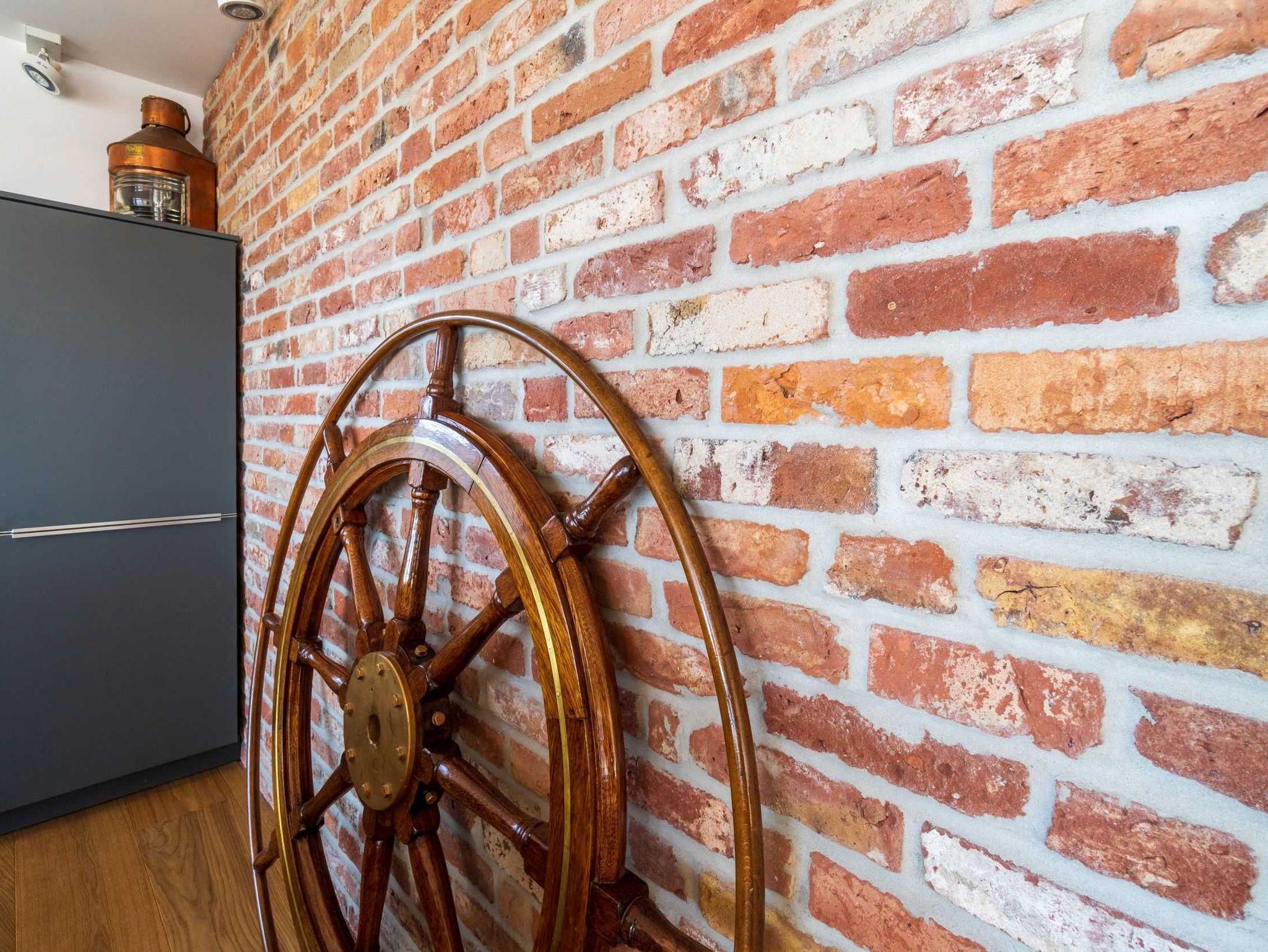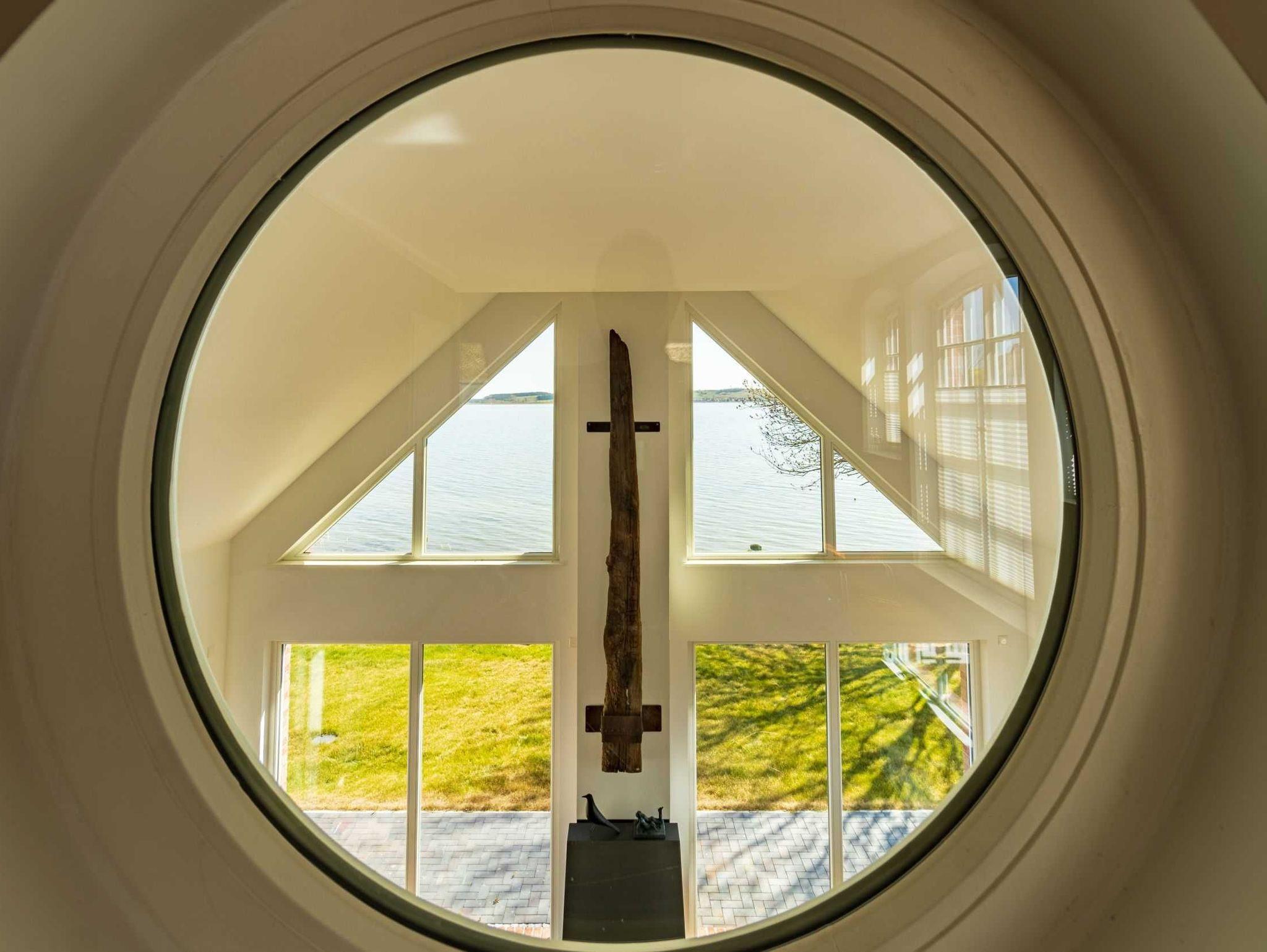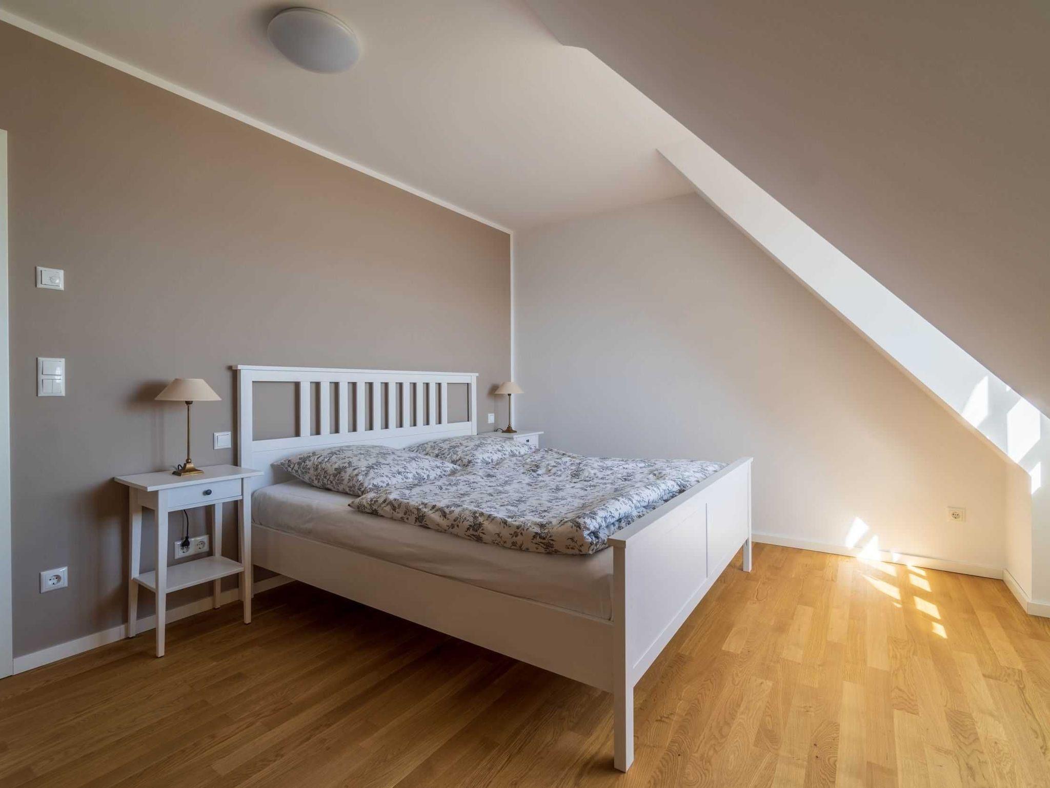Über den geräumigen Eingangsbereich kommen Sie in das Obergeschoß mit 3 Schlafzimmern, die jeweils mit einem Doppelbett sowie Schrank und TV ausgestattet sind. Im größten der 3 Schlafzimmer haben Sie einen herrlichen Blick durch ein Bullauge auf den Wohnbereich und den Bodden.