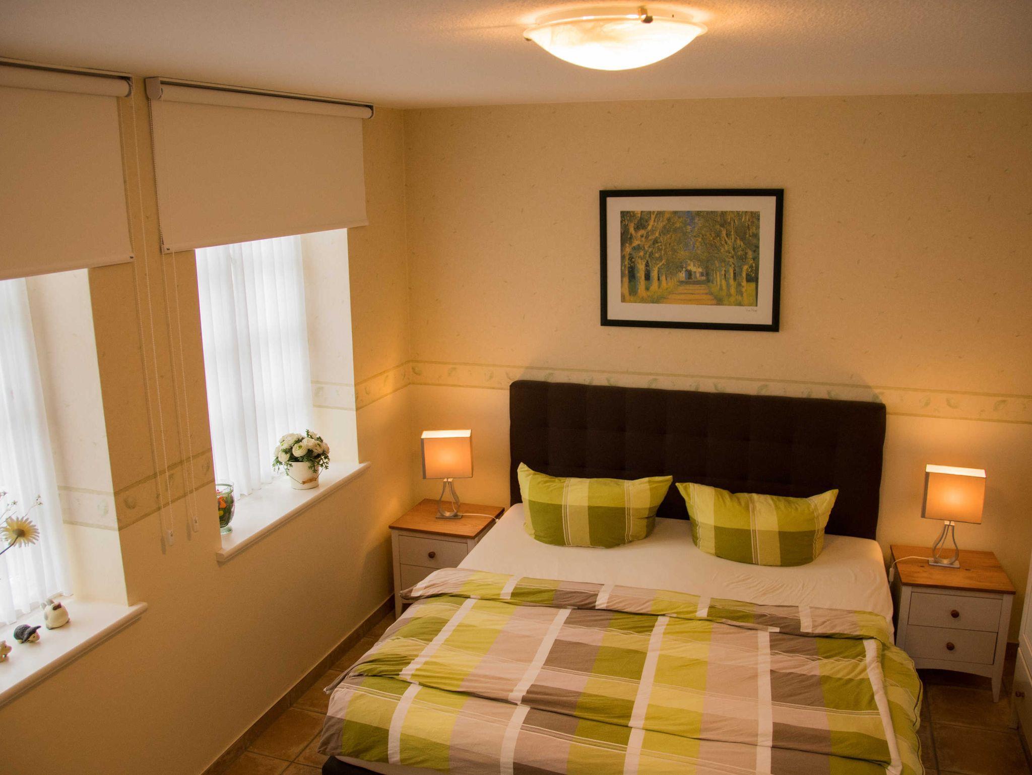 Diese wunderschöne im modernen Landhausstil eingerichtete Erdgeschosswohnung (ca. 55 qm) mit separatem Eingang verfügt über ein großzügiges Schlafzimmer mit Boxspringbett (180x 200 cm) und einem Extrabett, das auf 160 x 200 cm ausgezogen werden kann sowie Verdunkelungsmöglichkeiten.
