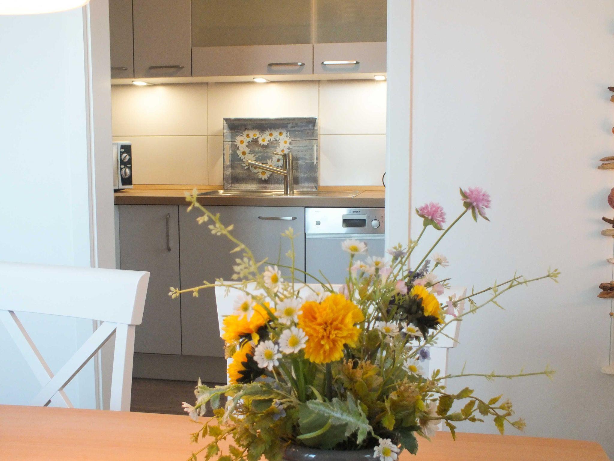 Für Freunde der kulinarischen Unabhängigkeit steht die voll ausgestattete Küche mit Geschirrspüler zur Verfügung. Neben einem Kühlschrank und einem Gefrierschrank, einem Backofen, Mikrowelle und E-Herd (Ceranfeld), stehen Ihnen auch ein Wasserkocher, eine Kaffeemaschine und ein Toaster bereit. Das hell erleuchtete Tageslicht-Badezimmer mit ebenerdiger Dusche verfügt über ein WC und einen Waschtisch mit großem Spiegel. Die dort vorhandene Waschmaschine wird Ihnen kostenfrei zur Verfügung gestellt. Alle vorhandenen Räume, bis auf die Küche, sind zur Unterstützung der Privatsphäre mit blickdichten Plissees ausgestattet.