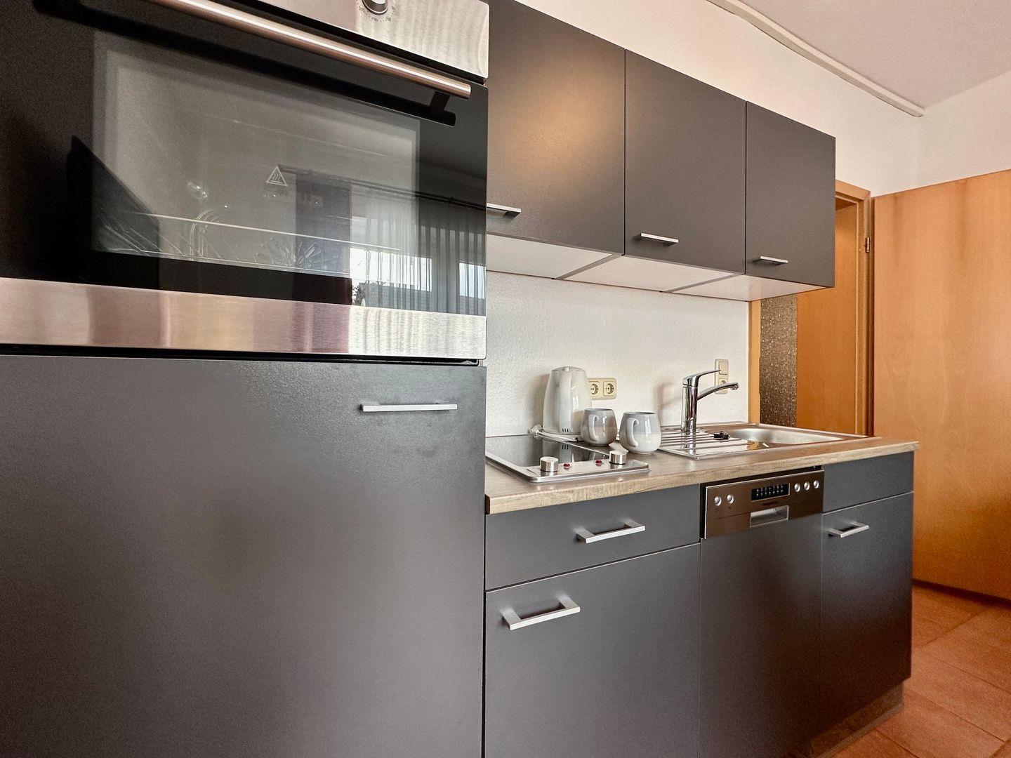 Der Wohnbereich ist offen und einladend gestaltet – mit einer gemütlichen Sitzecke und einem separaten Essplatz. Die Küche ist umfassend ausgestattet mit: