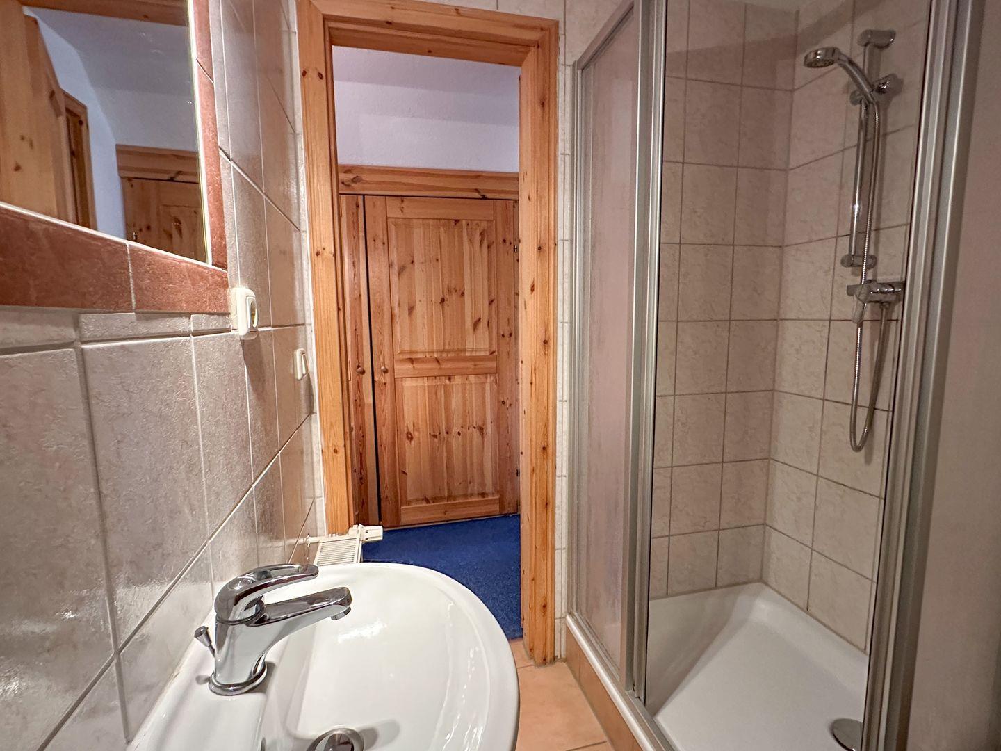 Das Badezimmer ist funktional ausgestattet mit Dusche , Handtücher sind inklusive.