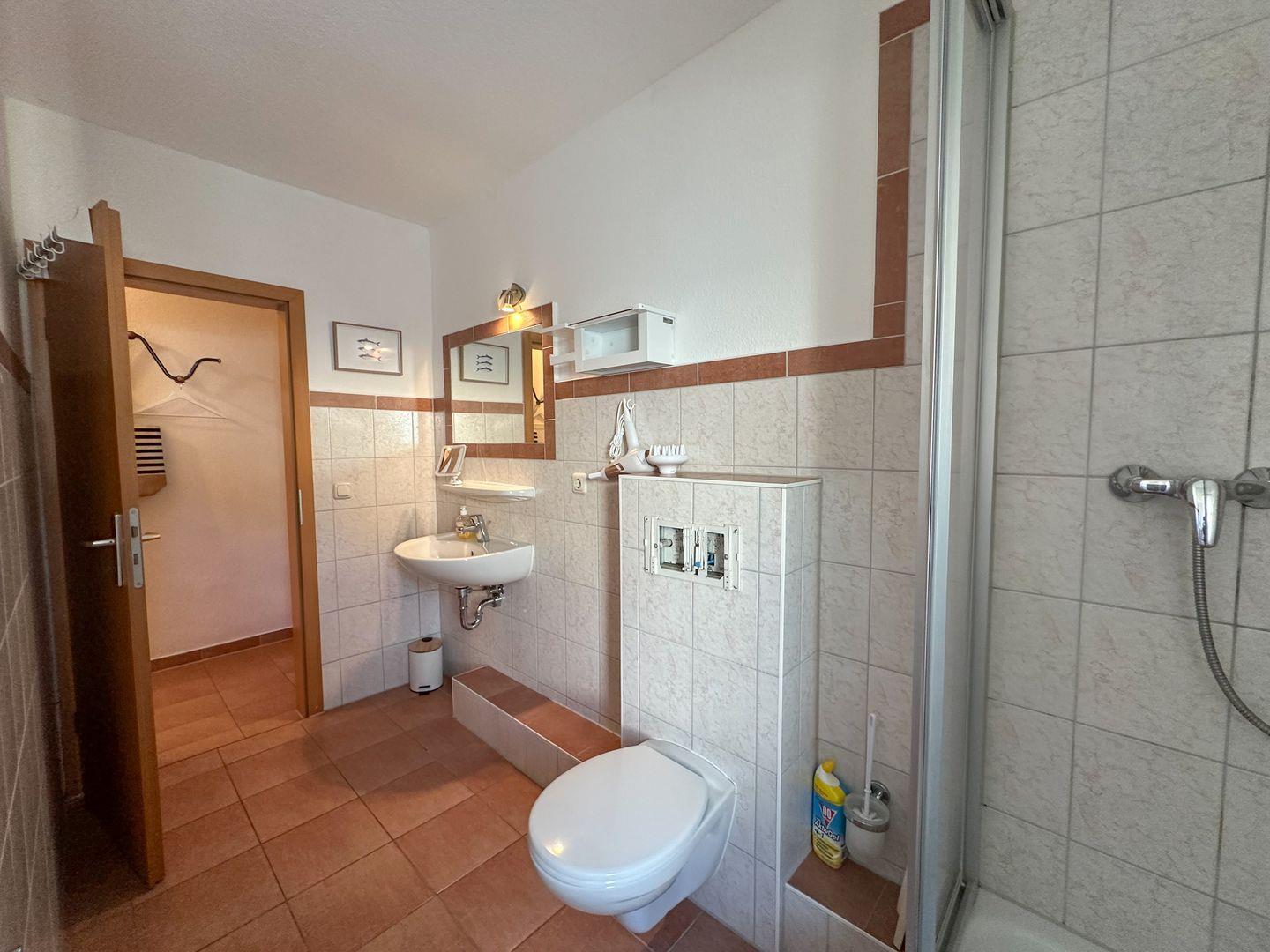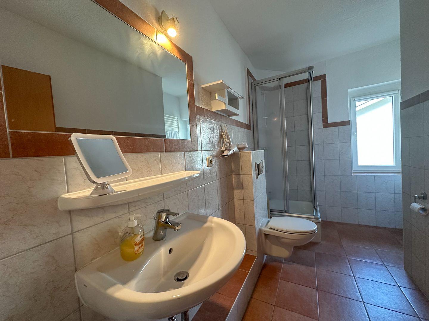 Das moderne Bad verfügt über eine Dusche, ein Waschbecken und ein WC. Frische Handtücher werden bereitgestellt, sodass Sie sich um nichts weiter kümmern müssen.