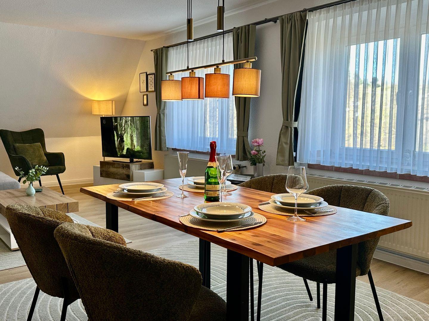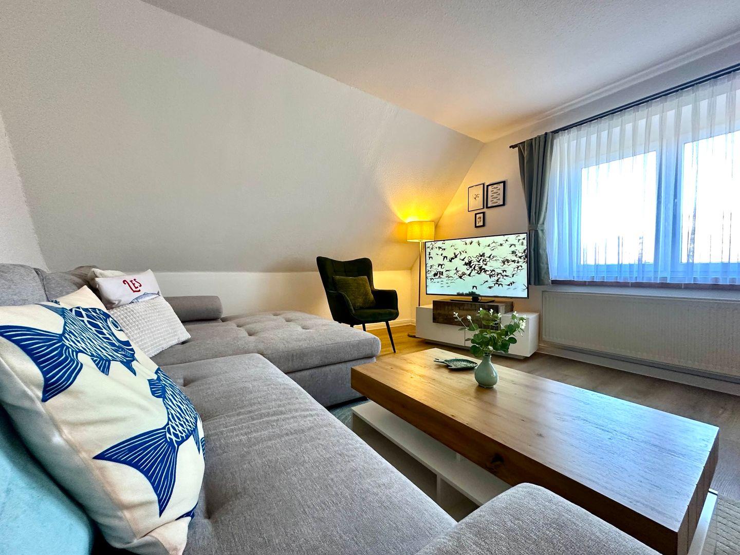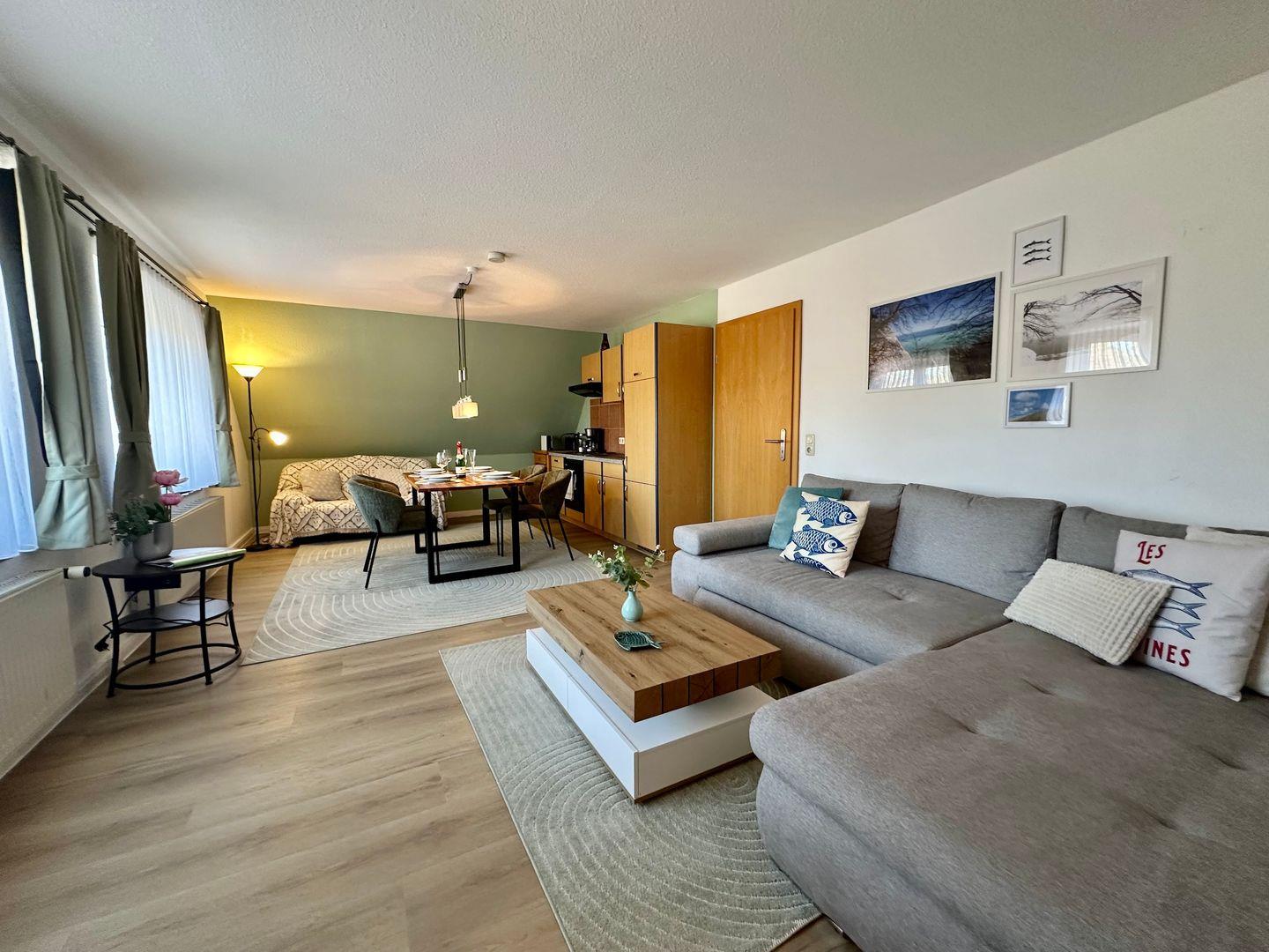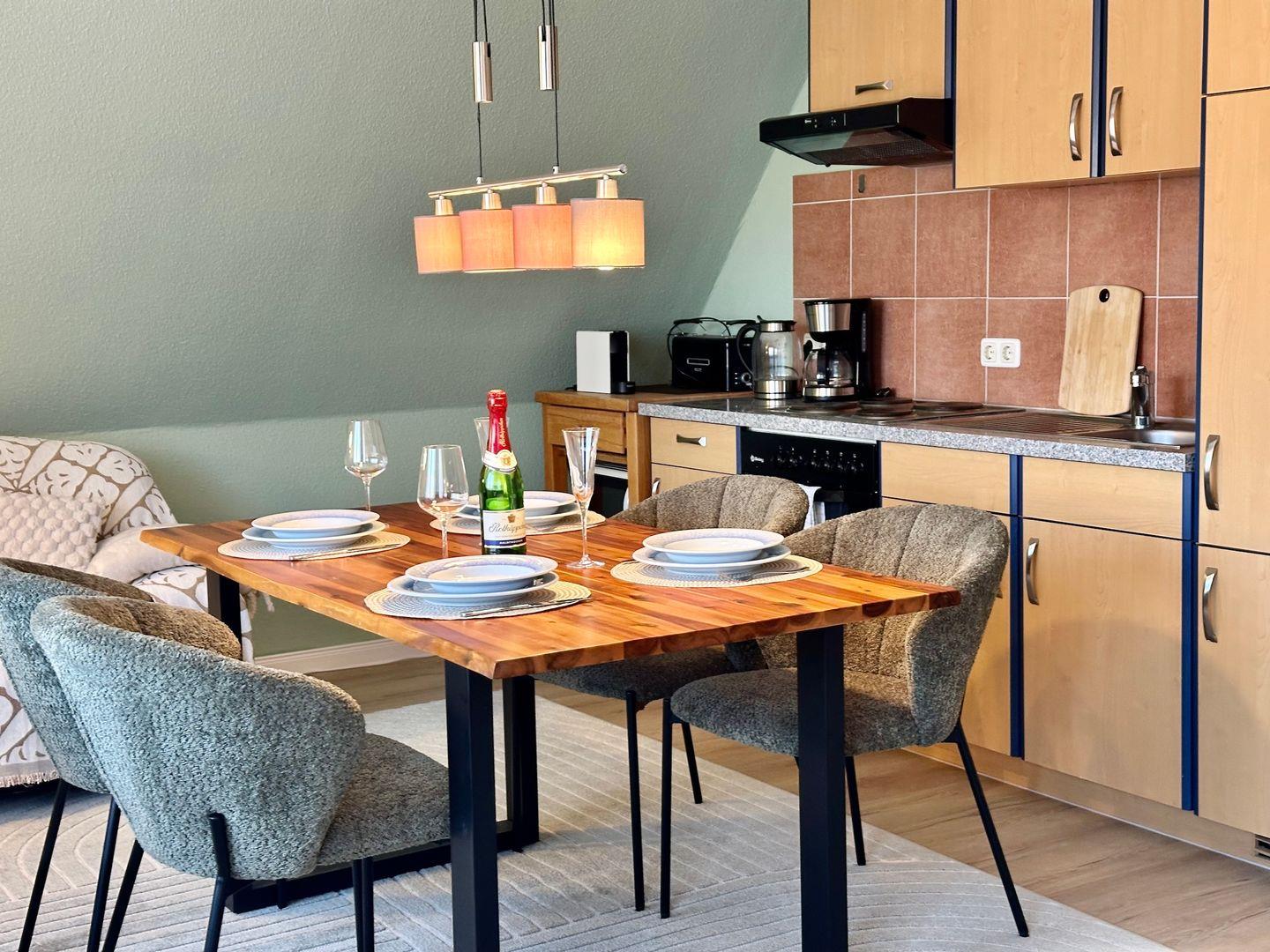 Der offene Wohn- und Essbereich bildet das Herz der Wohnung: eine gemütliche Sitzecke lädt zum Verweilen ein, während der separate Esstisch genug Platz für gemeinsame Mahlzeiten bietet. Die direkt angrenzende Küche ist voll ausgestattet – mit Herdplatte, Kühlschrank, Toaster, Wasserkocher, Kochgeschirr, Besteck und Geschirr – ideal für Selbstversorger, die auch im Urlaub nicht auf Komfort verzichten wollen.