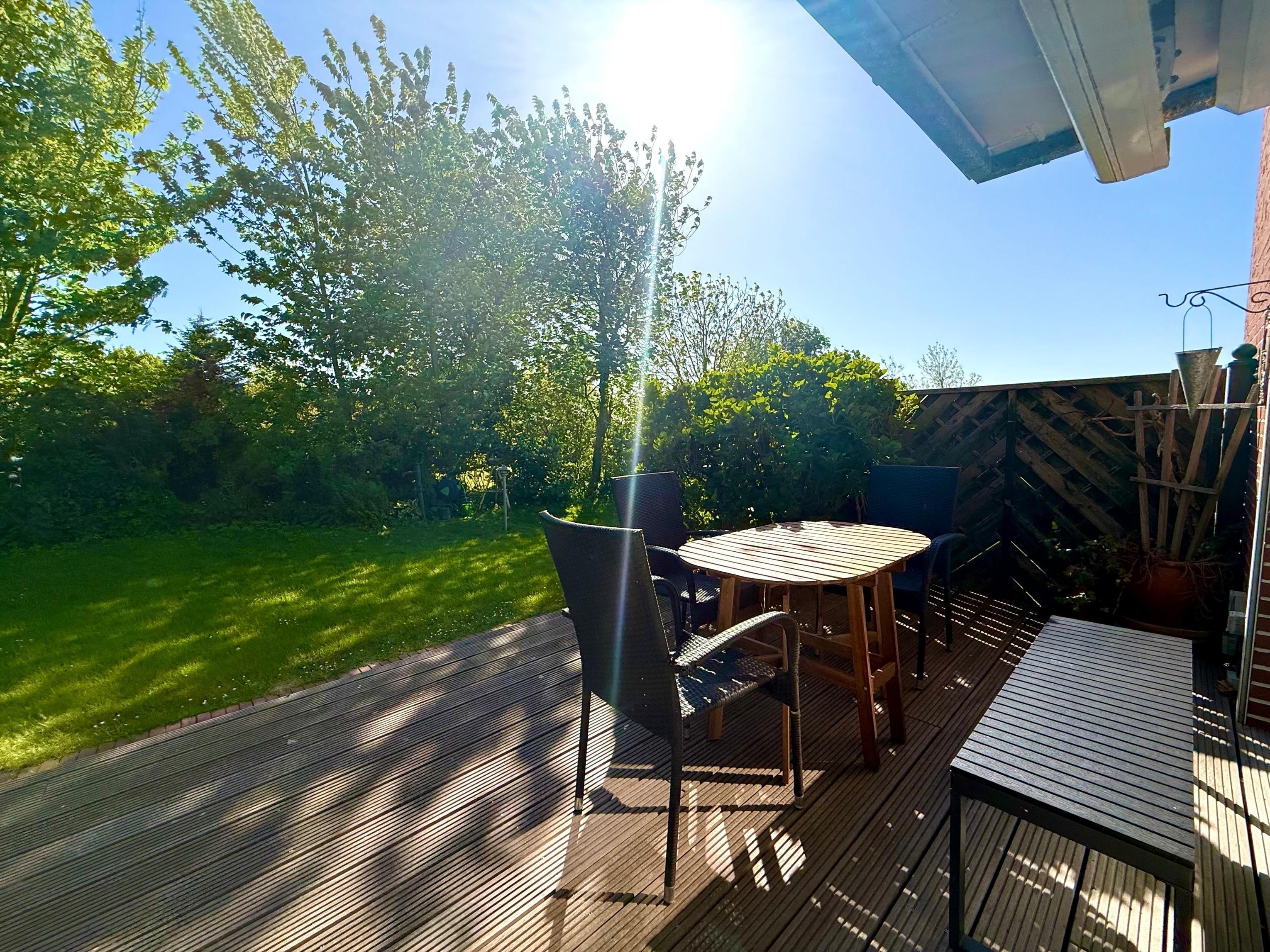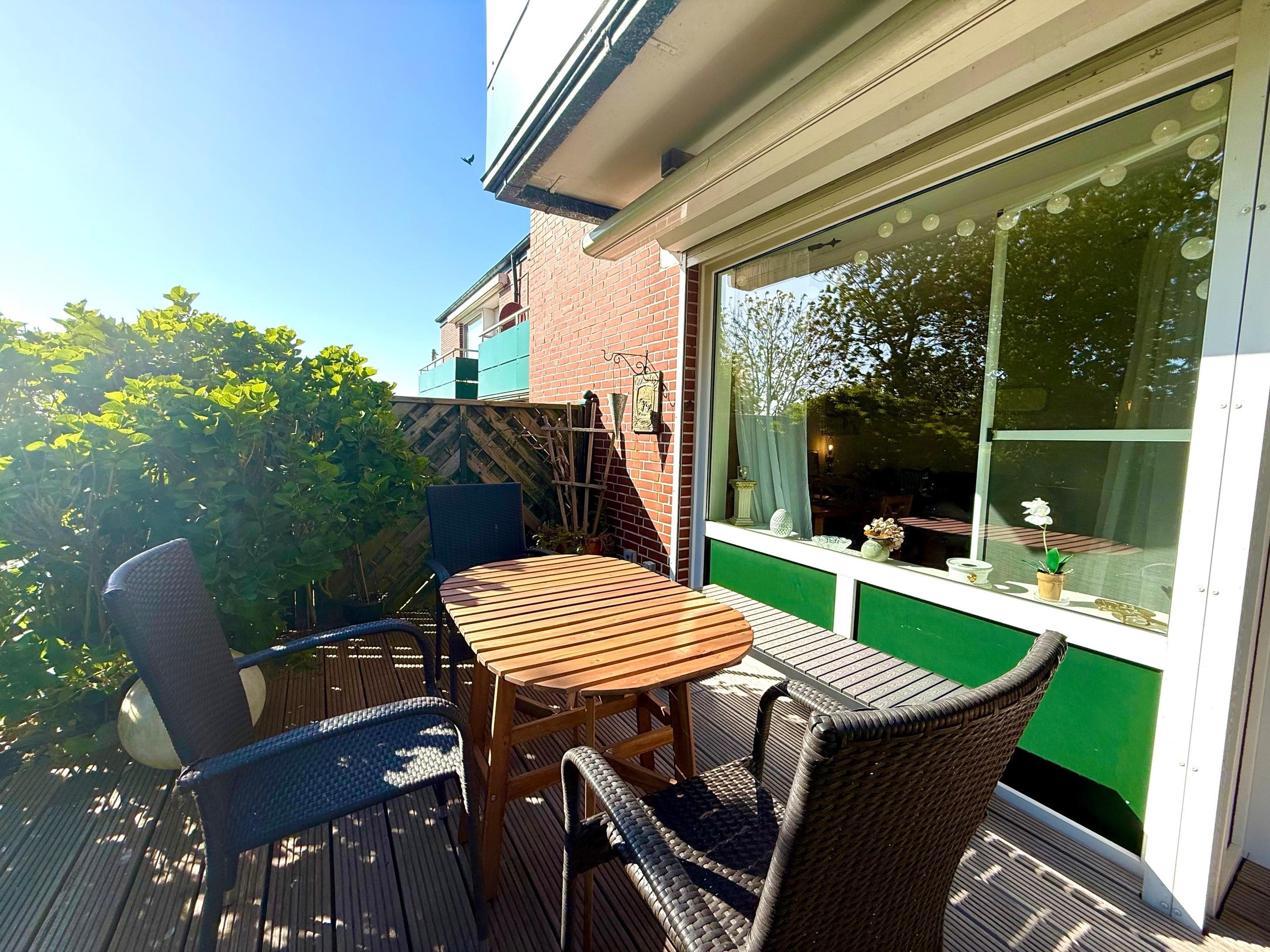 Richtige Urlaubsstimmung kommt auf der schönen Terrasse der Ferienwohnung auf. Im Badezimmer finden Sie eine Dusche und einen Haartrockner.