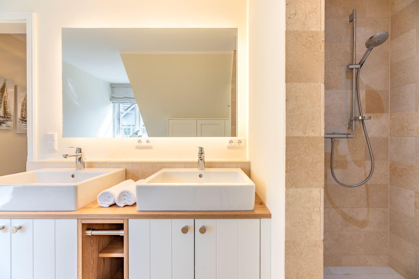 Ein großzügiger Flur sorgt für Übersichtlichkeit. Im Obergeschoss befinden sich zwei liebevoll gestaltete Schlafzimmer mit je einem Doppelbett, ausgestattet mit Einbauschränken für erholsamen Schlaf und jeweils einem Fernseher. Beide Zimmer verfügen über Verdunklungsplissees. Des Weiteren stehen zwei moderne Duschbäder mit ebenerdiger Dusche und WC zur Verfügung – eines davon ist zusätzlich mit einer Badewanne ausgestattet. Eine separate Sauna rundet das Angebot ab.