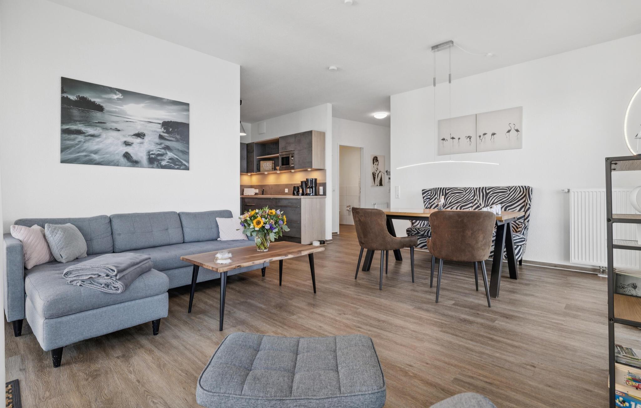 Denne smukke ferielejlighed byder jer velkommen med et lyst og stilfuldt interiør, hvor store vinduer tilbyder en storslået udsigt over vandet. Tilbered lækre måltider med venner og familie med friske, regionale ingredienser, planlæg jeres aktiviteter ved det indbydende spisebord, og slap af efter en lang dag i den beroligende havluft i saunaen, svøm et par baner i den fælles pool, eller sæt jer til rette til en hyggelig filmaften.