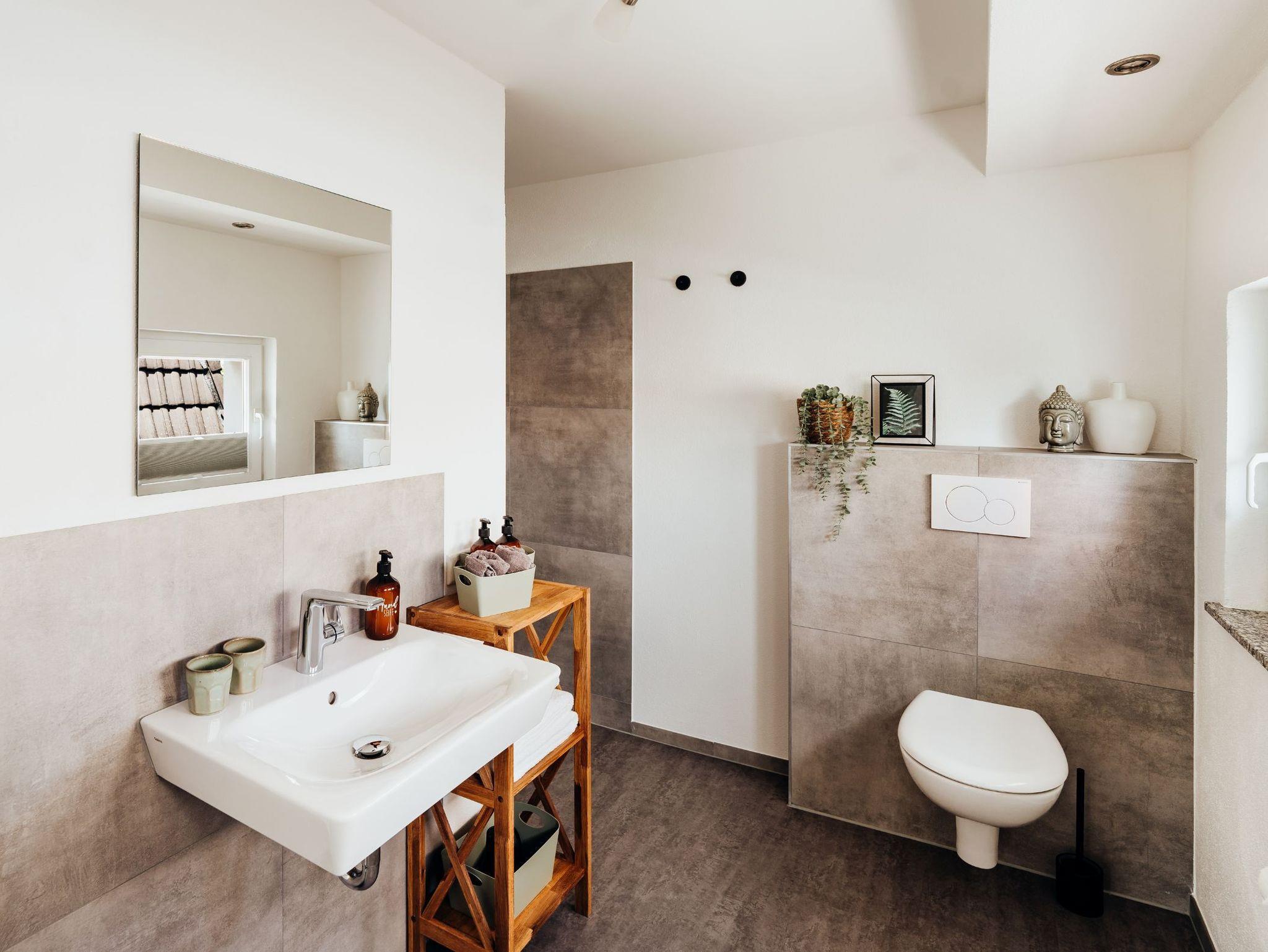 Badezimmer: Modern und lichtdurchflutetes Tageslichtbad mit einer XL-Dusche und Rainshower-Funktion, Föhn.