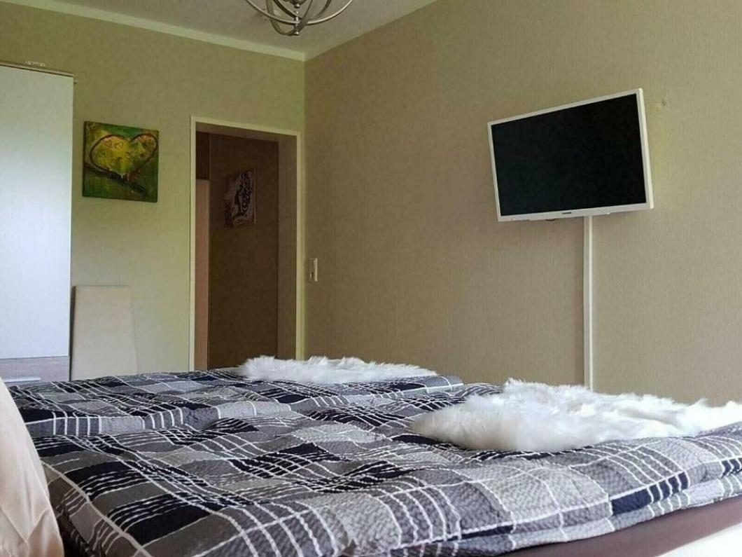 Im Schlafzimmer finden Sie 2 Boxspringbetten sowie ein TV-Gerät.