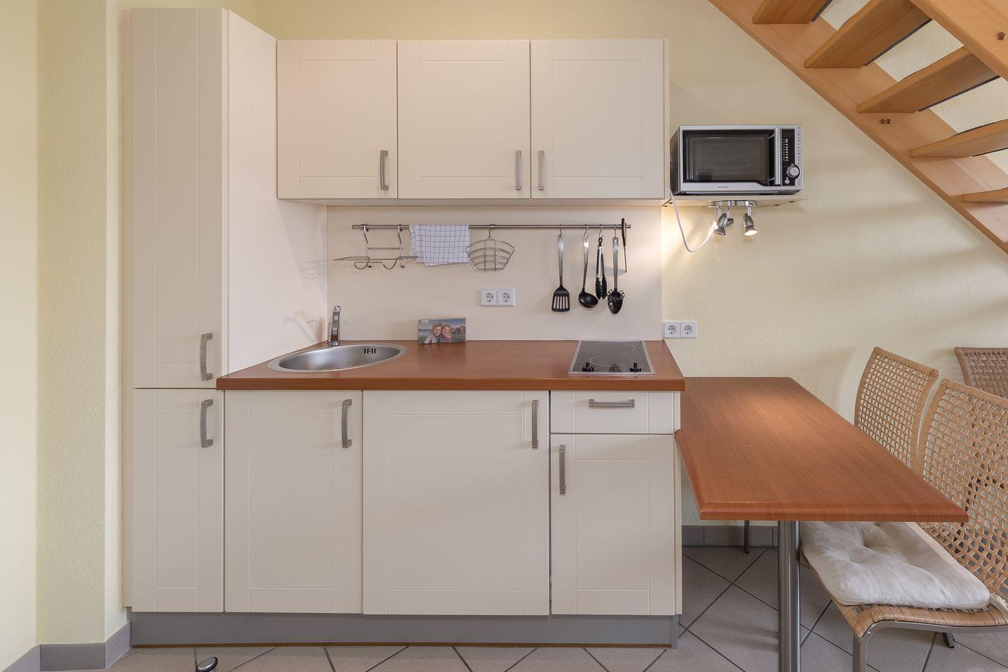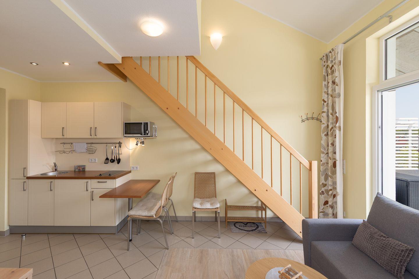 Das Apartment bietet Platz für bis zu 4 Personen auf 2 Etagen mit offener Schlafempore und einem abgegrenztem Kinderzimmer, Wohn-/Essbereich, Pantryküche, Badezimmer, Balkon, PKW-Stellplatz. Für den perfekten Start in den Urlaub sind die Betten bei Anreise frisch bezogen und eine Erstausstattung Handtücher liegt bereit. Die Nutzung des Schwimm-und Fitnessbereichs sowie der Saunalandschaft sind im Mietpreis inklusive.