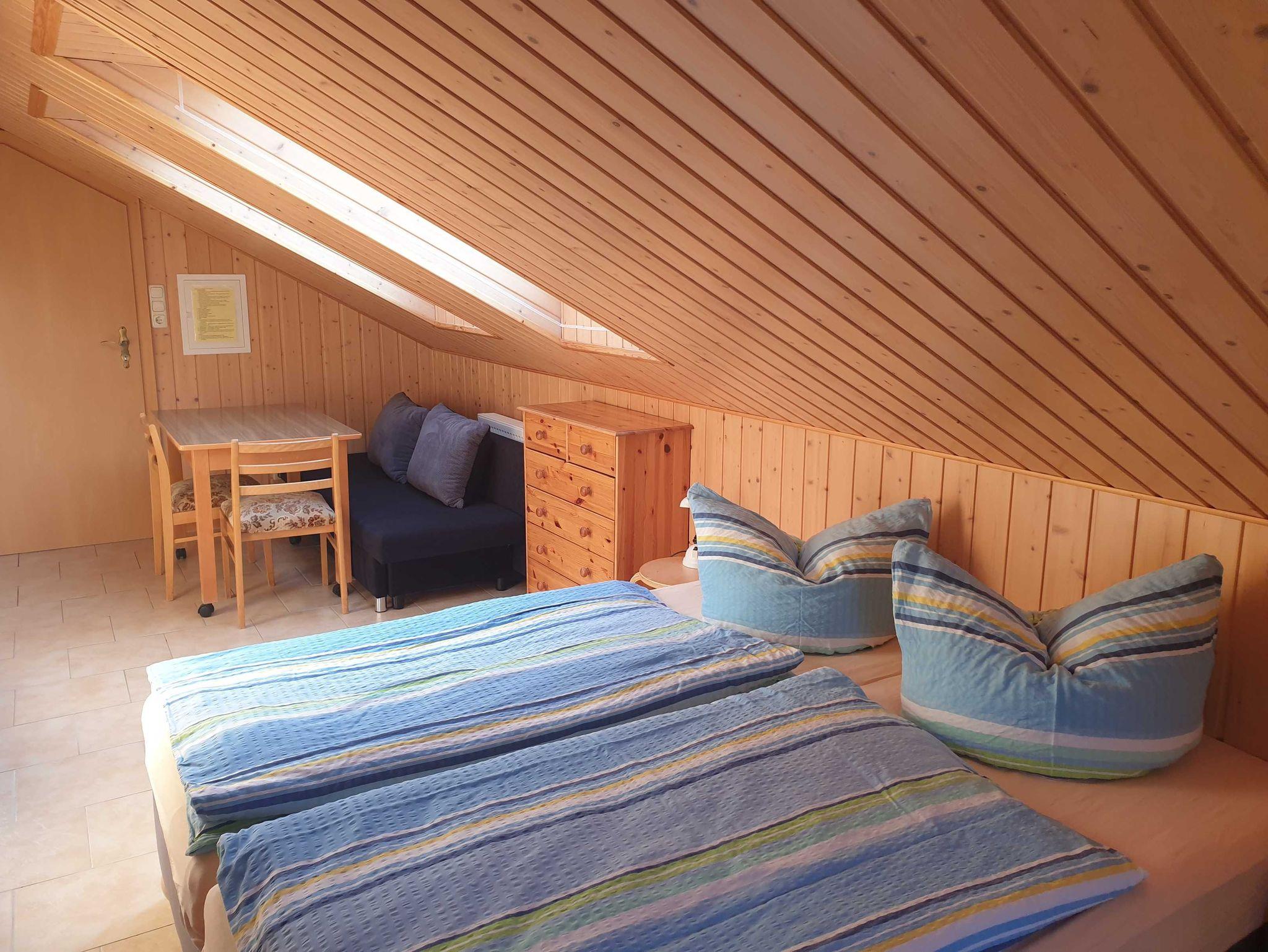 Die helle, ruhig gelegene, im Dachgeschoss befindliche Nichtraucherwohnung ist nach Südwesten ausgerichtet und am besten für zwei Personen geeignet. Für eine dritte Person ist eine Aufbettung gegen Entgelt möglich. Die Ferienwohnung ist voll gefliest, und die Wände sind mit hellem Fichtenholz getäfelt. Sie verfügt über einen Raum mit Sofa, Pantryküche, Kühlschrank mit Gefrierfach, Mikrowelle, Minibackofen, zwei Betten, SAT-TV und Spielesammlung sowie ein Bad mit Dusche und WC. Die große Wiese lädt zu sportlichen Aktivitäten, zum Sonnen und Grillen ein. Weiterhin stehen Ihnen ein kleiner Bootssteg, Gartenmöbel, eine Wäschespinne, Grill und Abstellmöglichkeiten für PKW, Fahrrad und Boot zur Verfügung. Im Mietpreis inbegriffen sind Bettwäsche, Handtücher, Geschirrhandtuch, Strom, Wasser und Heizung. Fahrräder und Boote können Sie bei uns vor Ort zum Haustarif mieten.