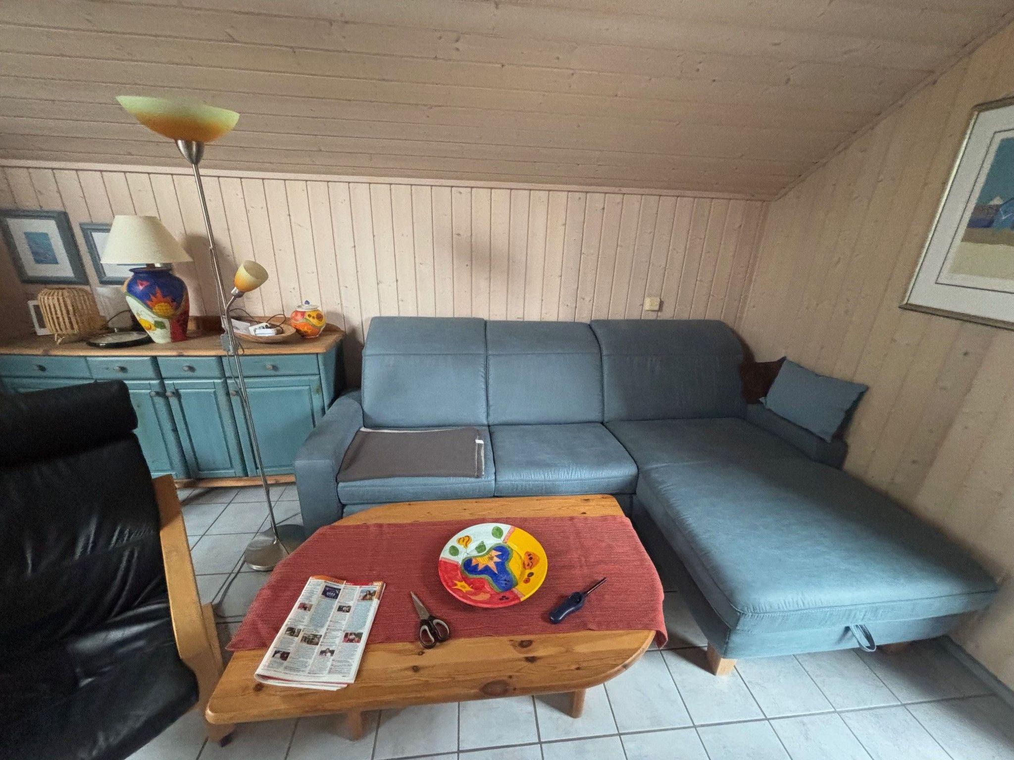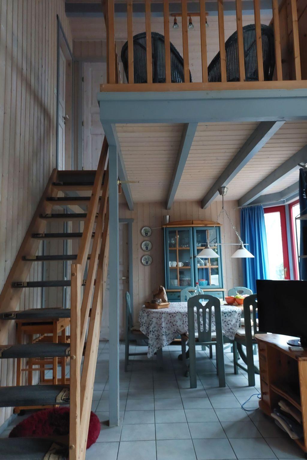 The interior of the Nordic wooden house has a warm and inviting atmosphere. The floors are practically laid with tiles or laminate, making them easy to maintain during your stay. For cosy evenings, there is a comfortable seating area in the living room, complemented by an inviting wood-burning stove. For entertainment, there is a flat-screen TV, internet access and an internet radio, while the electric heating and partial underfloor heating provide cosy warmth. The kitchen is fully equipped with a ceramic hob, oven, dishwasher, microwave, fridge and coffee machine, leaving nothing to be desired.