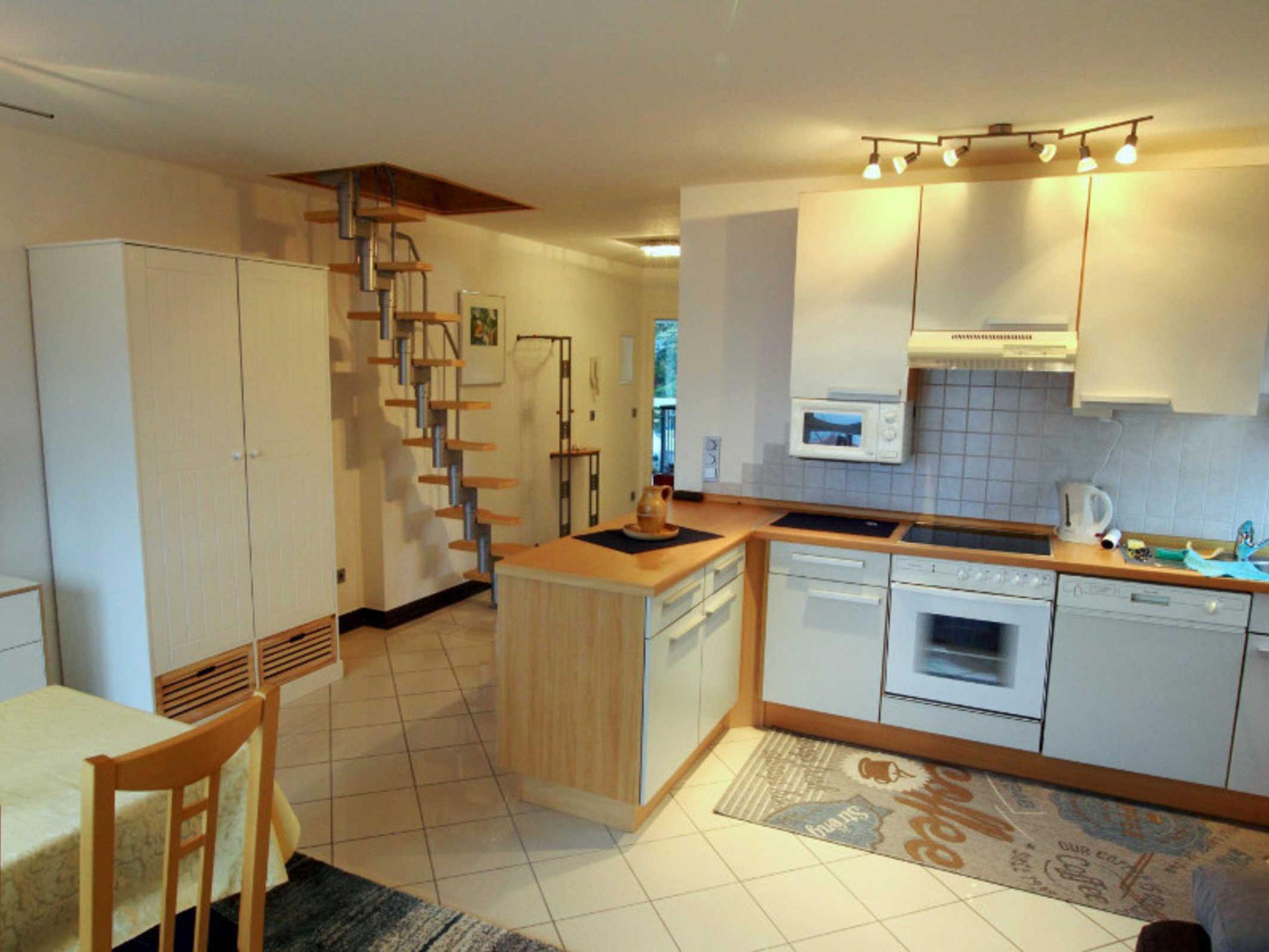 Im Wohn-Esszimmerbereich ist eine moderne Küche mit Elektroherd, Backofen, Kühlschrank, Gefrierfach, Spülmaschine und Mikrowelle eingebaut.
