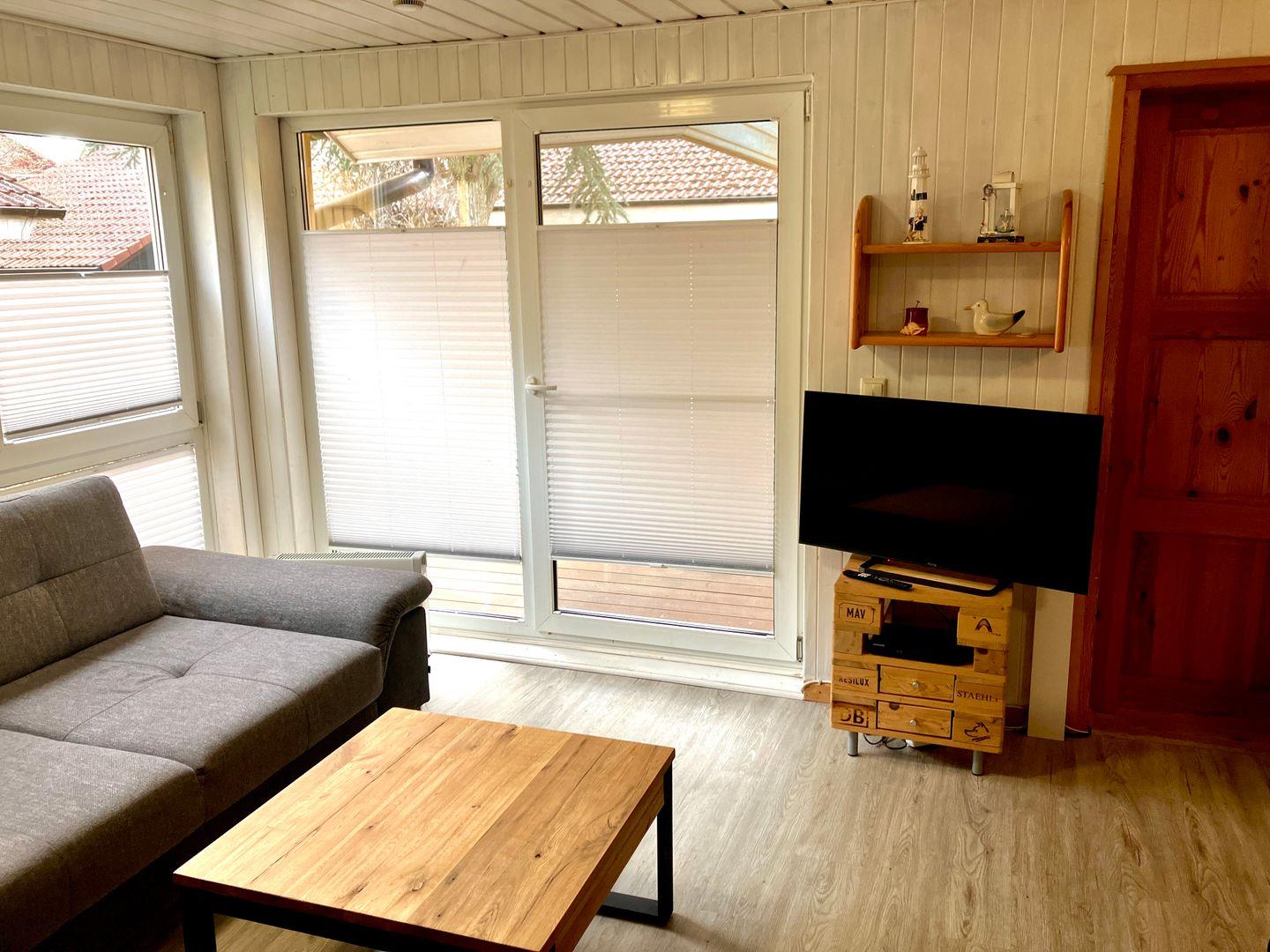 Die Doppelhaushälfte bietet Platz für bis zu 4 Personen auf einer Etage mit 2 Schlafzimmern, offenem Wohn- und Essbereich, Küchenzeile, Terrasse und Abstellraum.