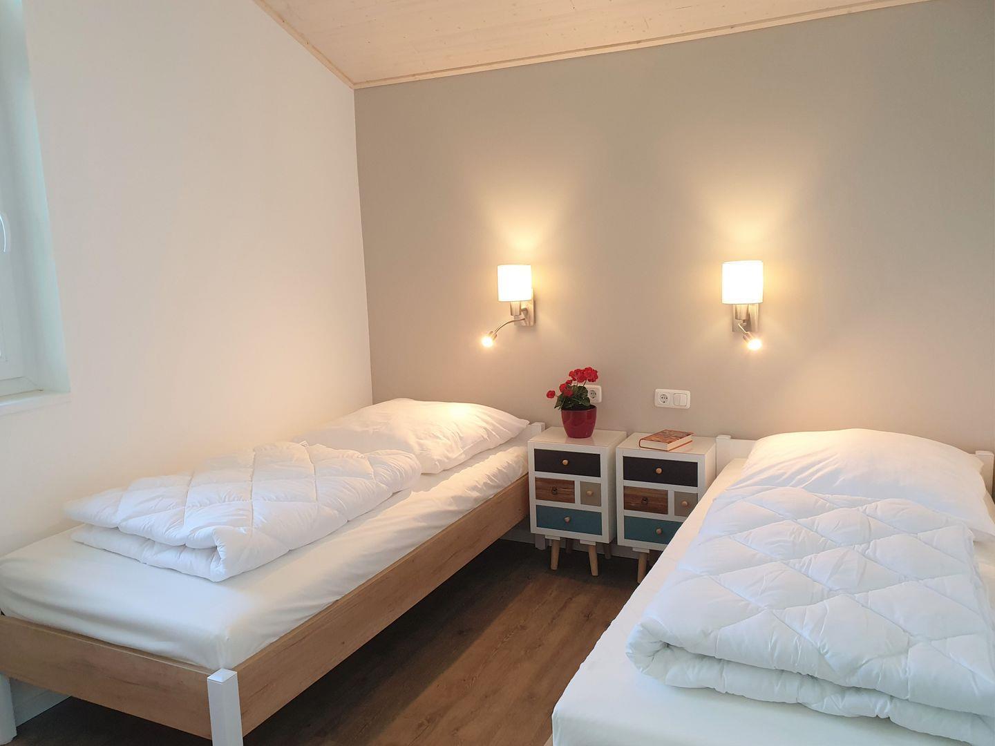 Das Ferienhaus im skandinavischen Stil bietet Platz für bis zu 4 Personen auf einer Etage mit 2 Schlafzimmern, Wohn-/Essbereich, Einbauküche, Badezimmer mit Sauna und Whirlpool, Terrasse und Pkw-Stellplatz.