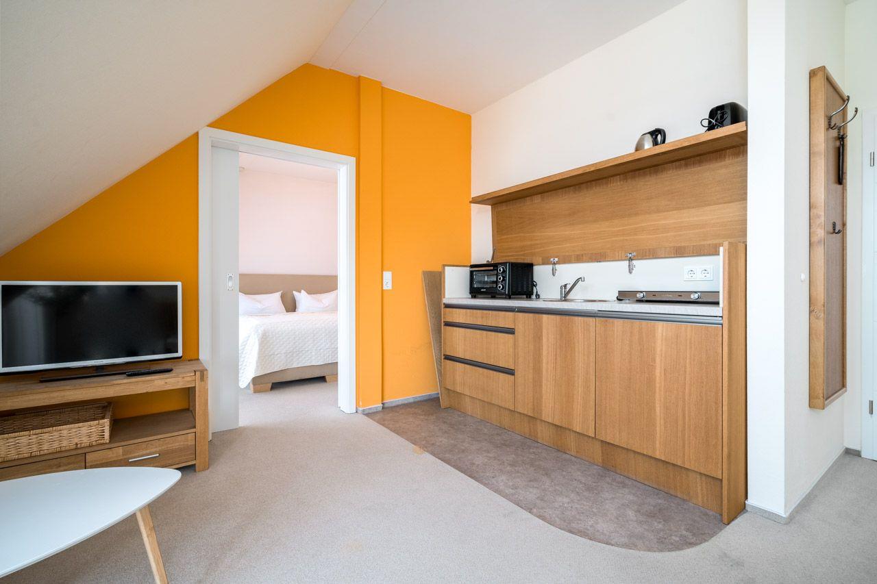 Die Kochnische ist komplett ausgestattet und lässt keine Wünsche offen. Sie finden hier einen Elektroherd mit zwei Platten, einen Backofen, einen Kühlschrank und eine Kaffeemaschine sowie sämtliche Küchenutensilien, die für die Zubereitung köstlicher Mahlzeiten notwendig sind. Auch Gewürze und Geschirr sind in ausreichender Menge vorhanden.