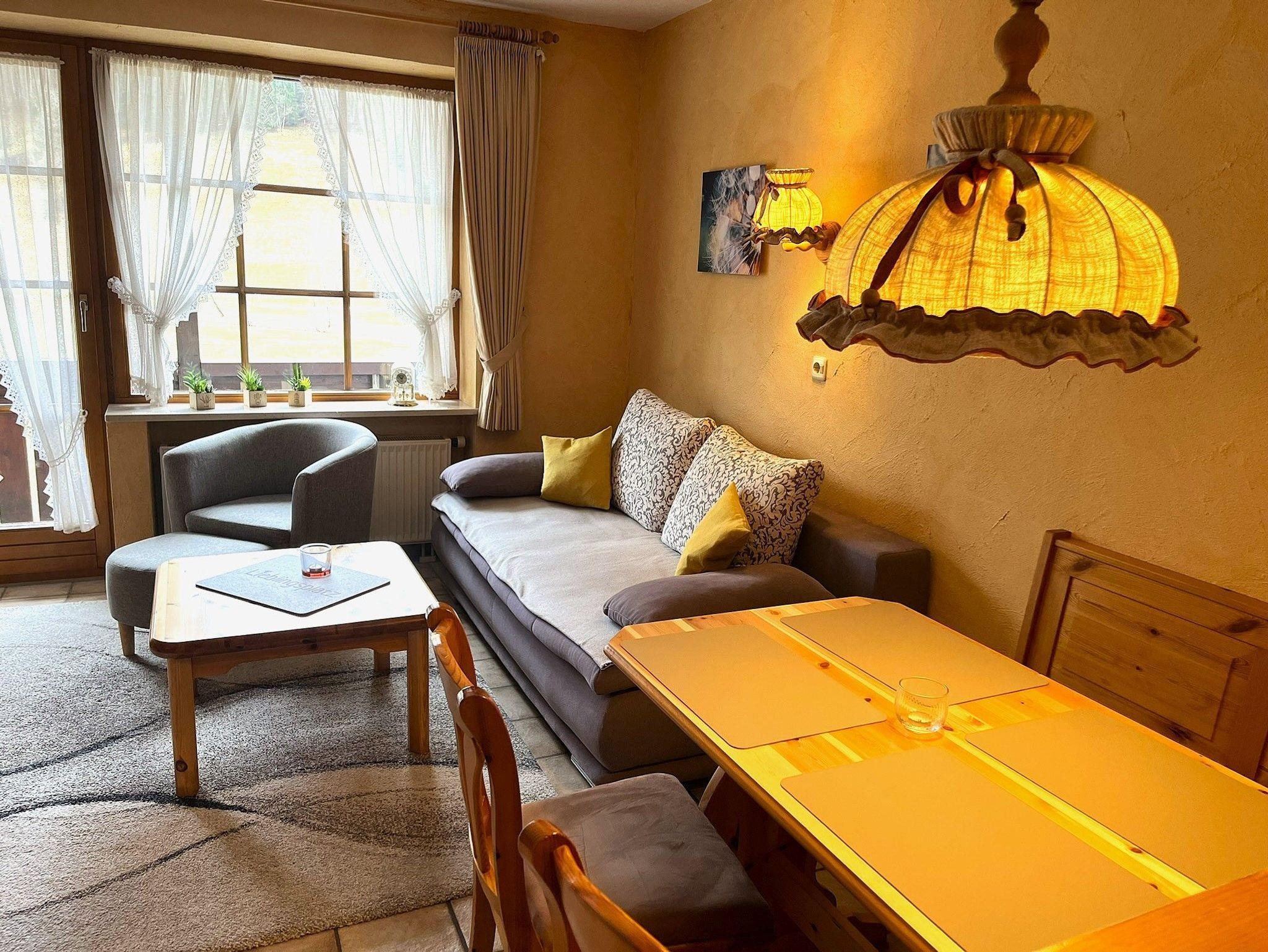 Die Ferienwohnung verfügt über ein Wohnzimmer mit neuer Schlafcouch für zwei Personen und bietet WLAN-Zugang. Die offene Küchenzeile ist mit ausreichend Geschirr sowie Mikrowelle, Filterkaffeemaschine, Kühlschrank, Herd mit Backofen, Toaster und Wasserkocher ausgestattet.