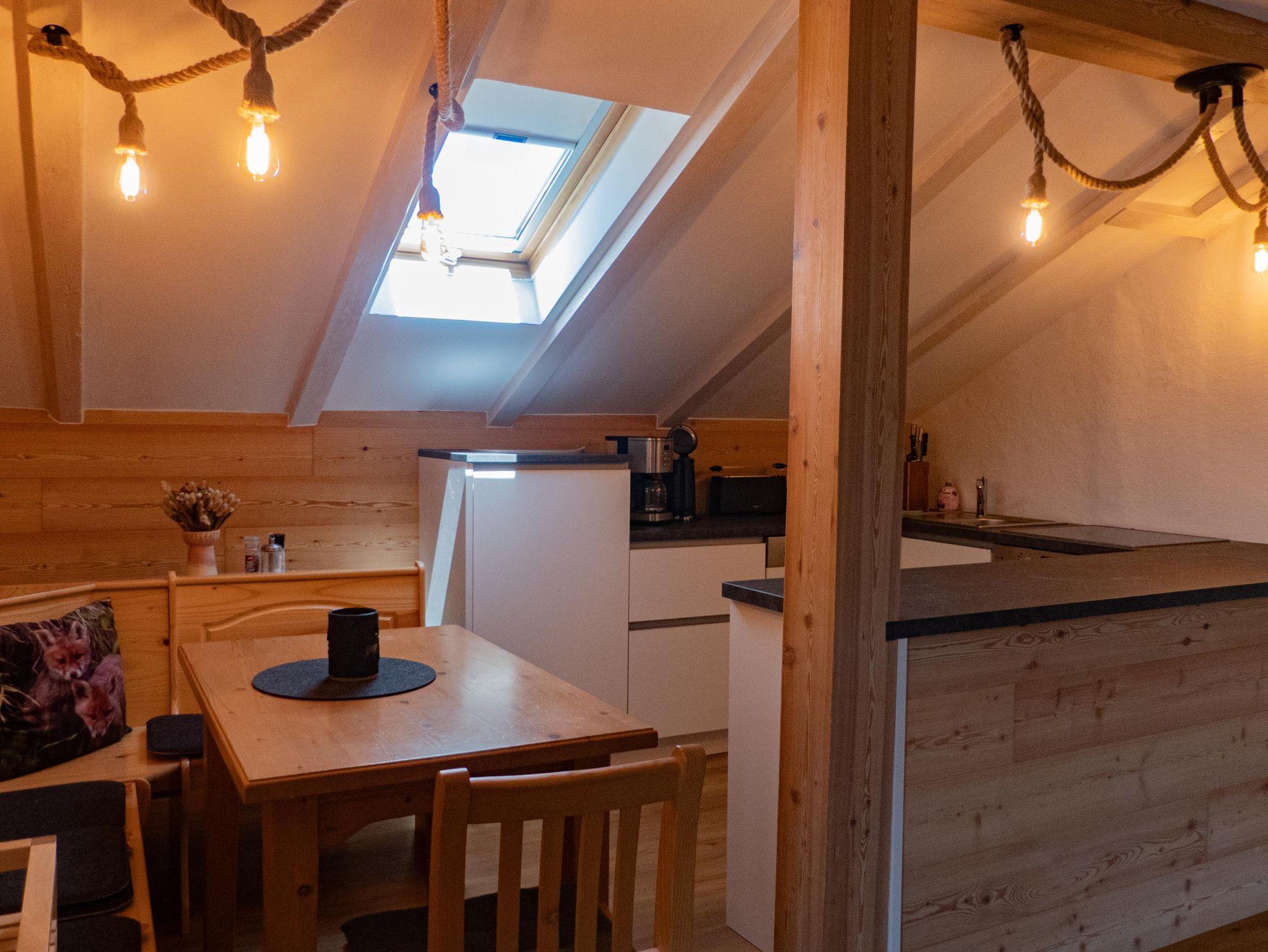Die neue Ferienwohnung Gipfelstürmer ist im Dachgeschoss im alpenländlichen Stil eingerichtet und bietet auf über 80 qm zwei separate Schlafzimmer (Bettwäsche vorhanden), eine voll ausgestattete Küchenzeile (Toaster, Backofen, Spühlmaschine, Kaffeemaschine, Eierkocher, Wasserkocher...) mit Essecke, ein Bad mit praktisch ebenerdiger (2cm) Dusche und ein großes Wohnzimmer mit Zugang zum West/Südwest - Balkon.